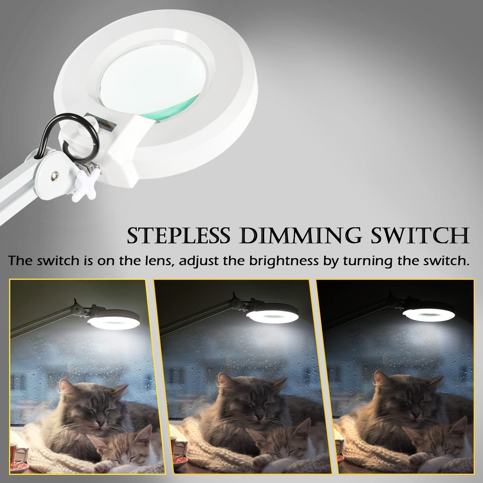 - [Stepless Dimmable LED Mag Lamp]: This Mag Lamp includes a built-in dimming power-saving LED fixture, it has 24 watts, 1,500 Lumens and a 6500k color temperature of a clear with different brightness adjustments. Simply rotate the power button to adjust the brightness level. Find the most suitable light according to your needs, great for reading, sewing, knitting, quilting, puzzles, crochet, cross stitch etc.