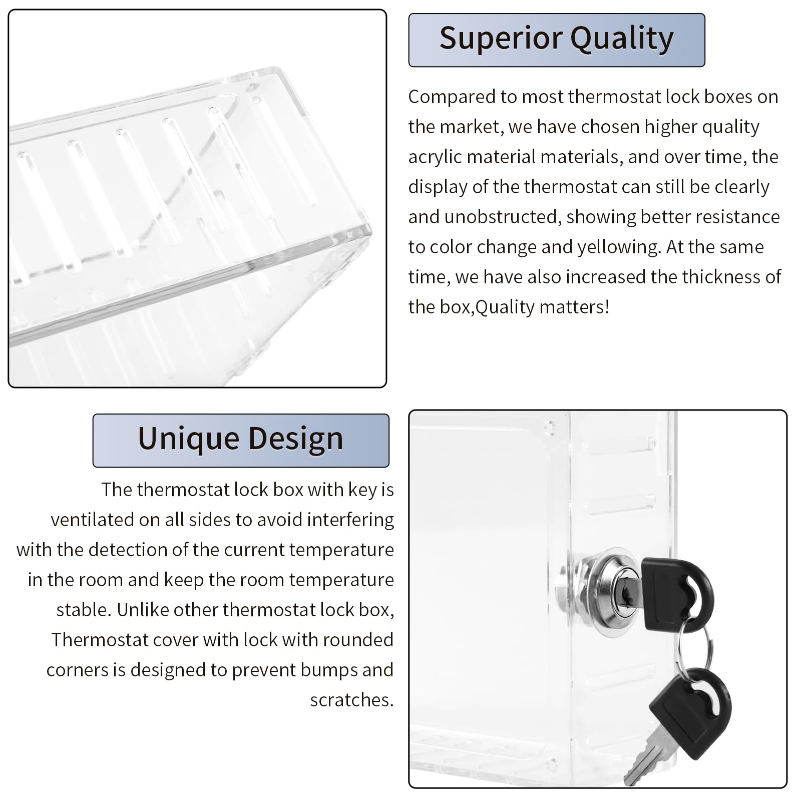- Unique Design: The thermostat lock box with key is ventilated on all sides to avoid interfering with the detection of the current temperature in the room and keep the room temperature stable. Unlike other thermostat lock box, Thermostat cover with lock with rounded corners is designed to prevent bumps and scratches