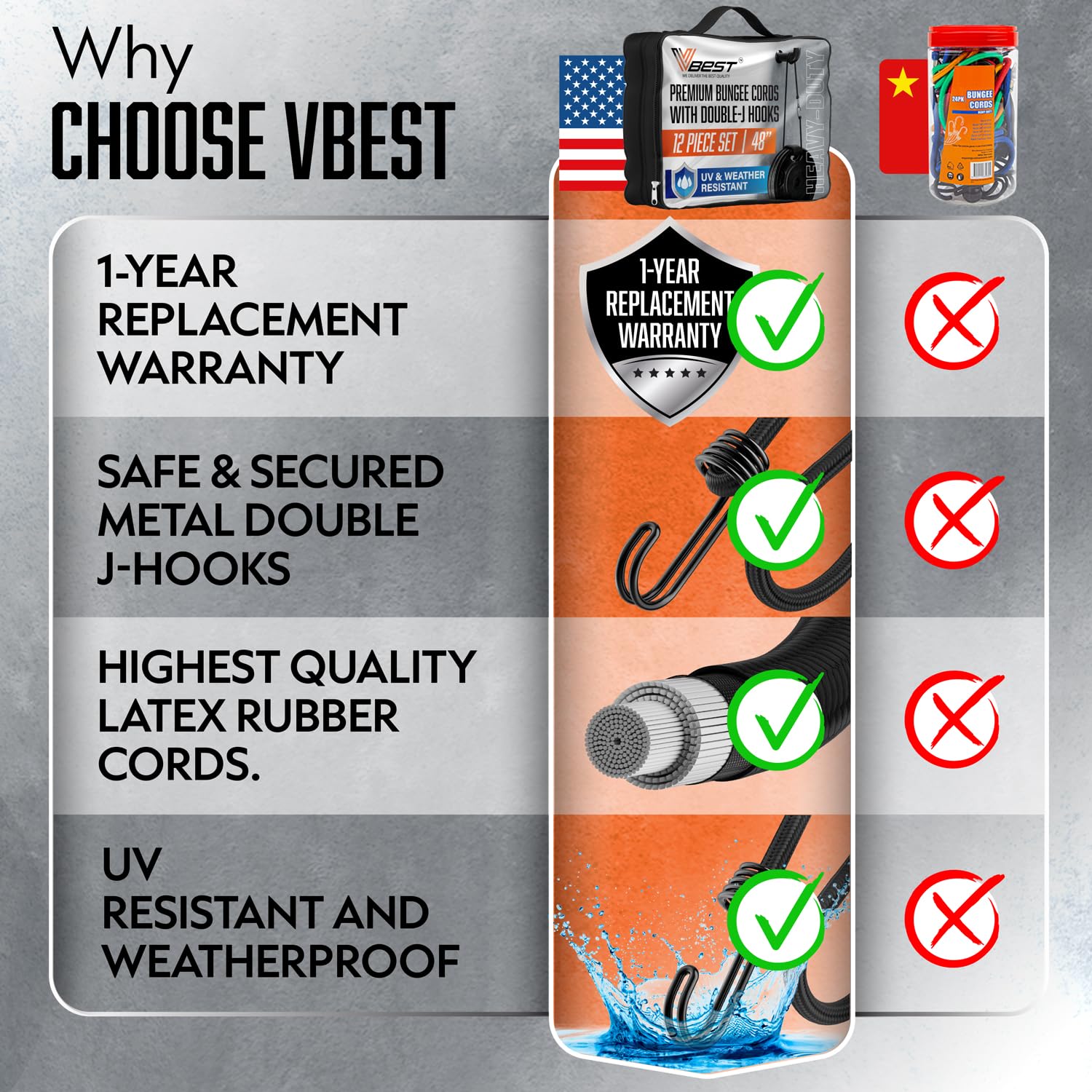 - UV and Weather-Resistant for Outdoor Durability: VBEST elastic heavy duty bungee cords are built with UV and weather-resistant materials, making these bunjee cords perfect for both indoor use and tough outdoor conditions.