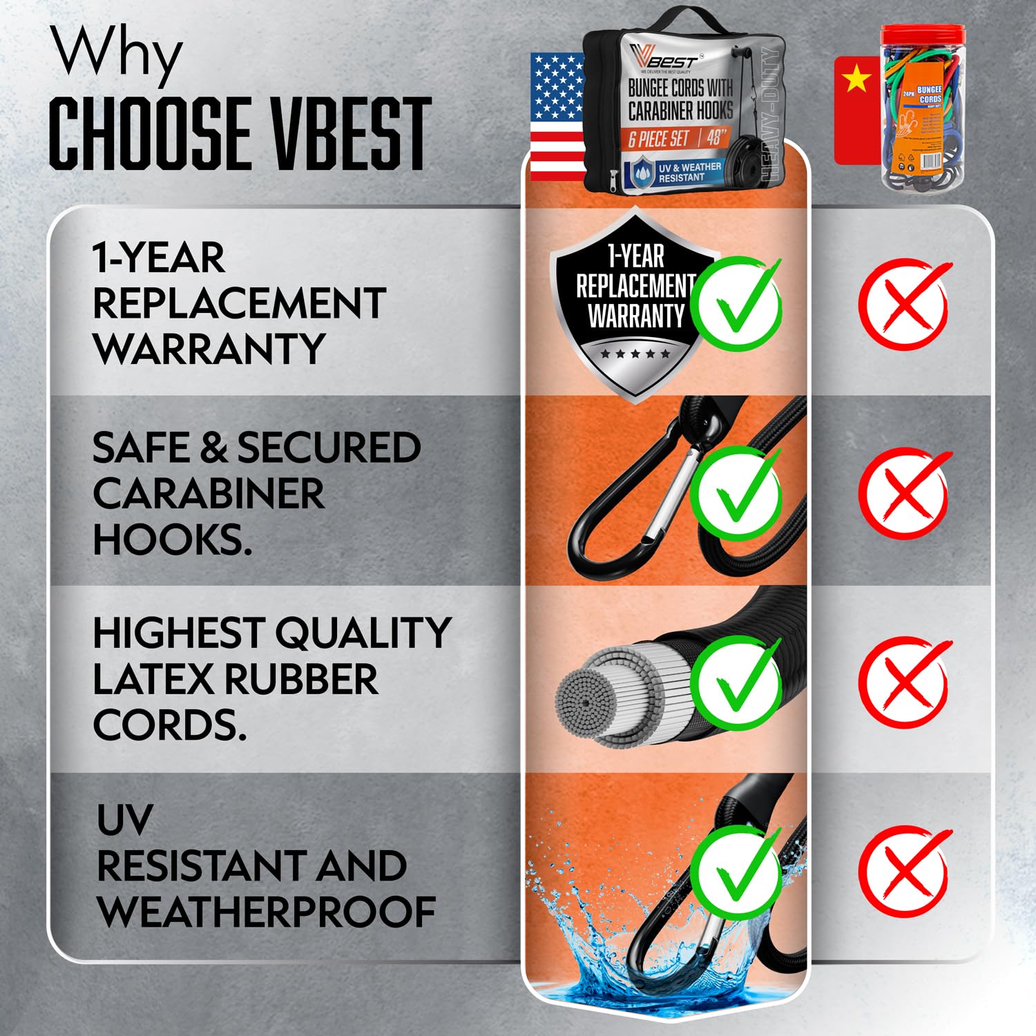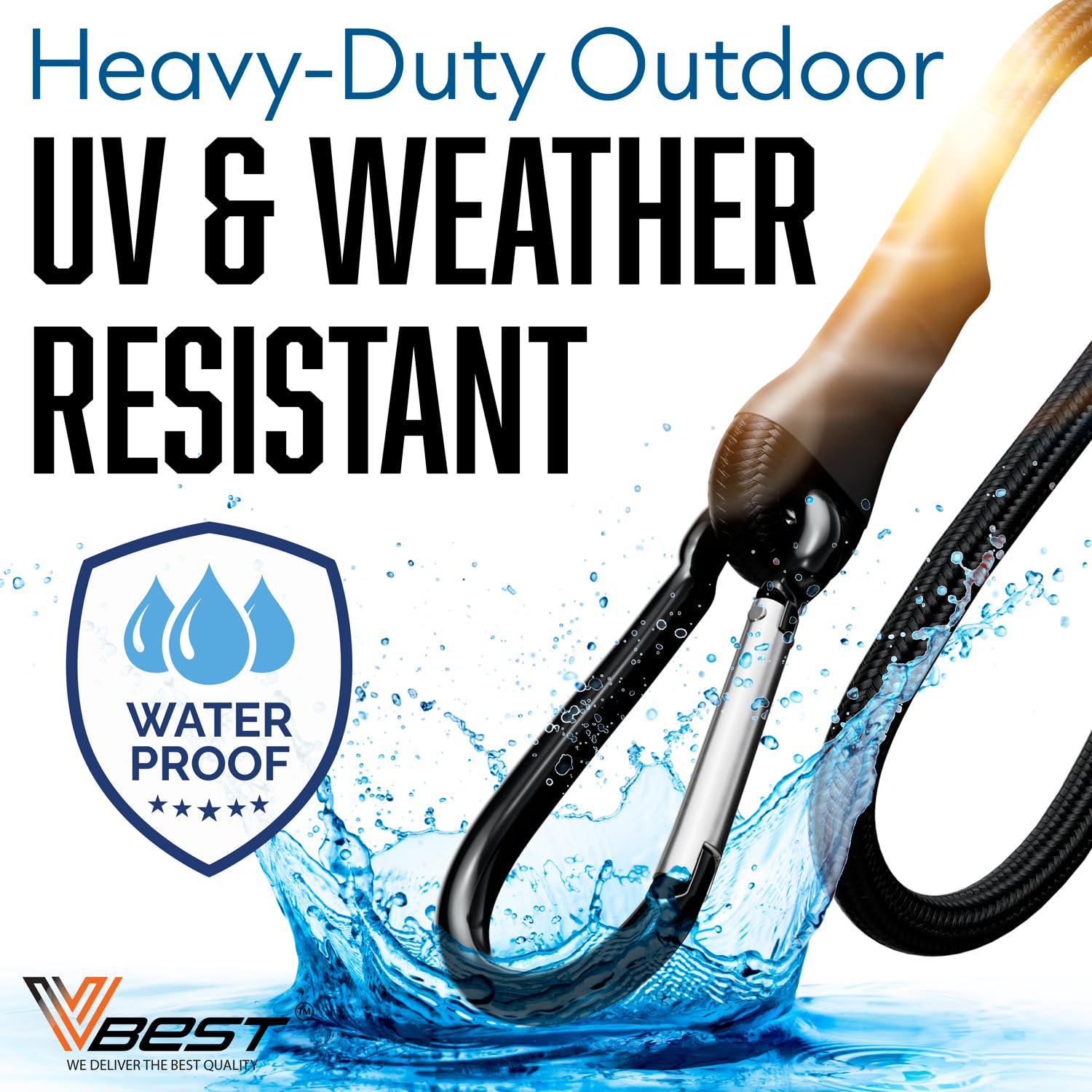 - UV and Weather-Resistant for Outdoor Durability: VBEST elastic heavy duty bungee cords are built with UV and weather-resistant materials, making these bungee cords with hooks perfect for both indoor use and tough outdoor conditions.
