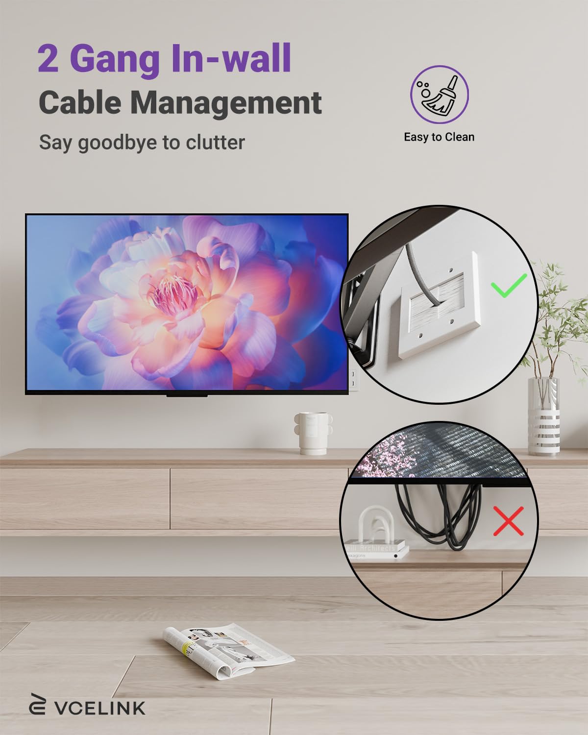 - EFFORTLESS CABLE MANAGEMENT FOR CLUTTER-FREE WALL: This 2-gang cable pass-through wall plate hides messy cables behind the wall to create a tidy environment. Its polished design and pure white surface make it well-suited for living rooms and offices.