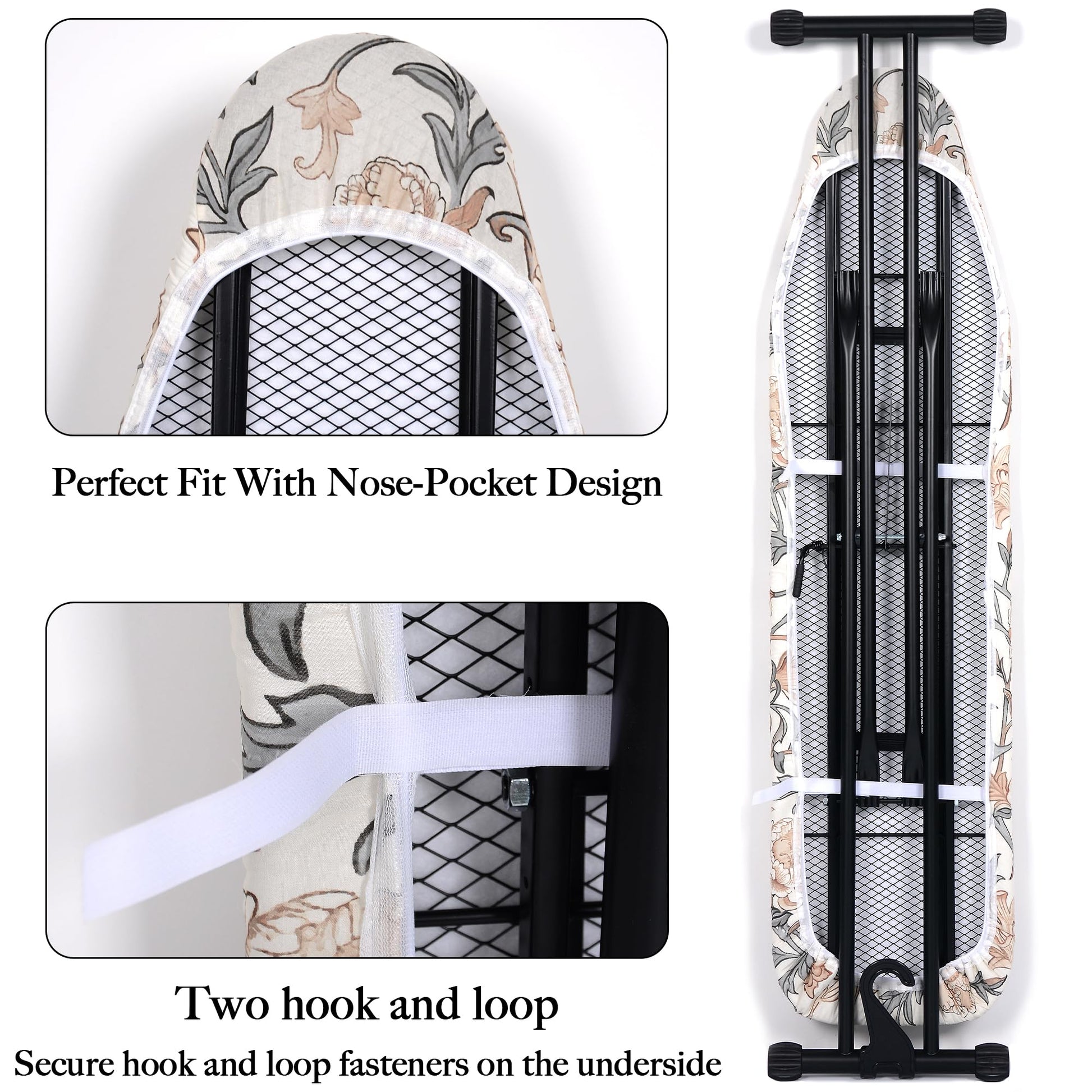 - The non-slip design with a premium elastic edge and adjustable hook-and-loop strap allows for easy setup in seconds. The iron board cover with padding stays securely in place, providing a snug fit that won’t shift during use.