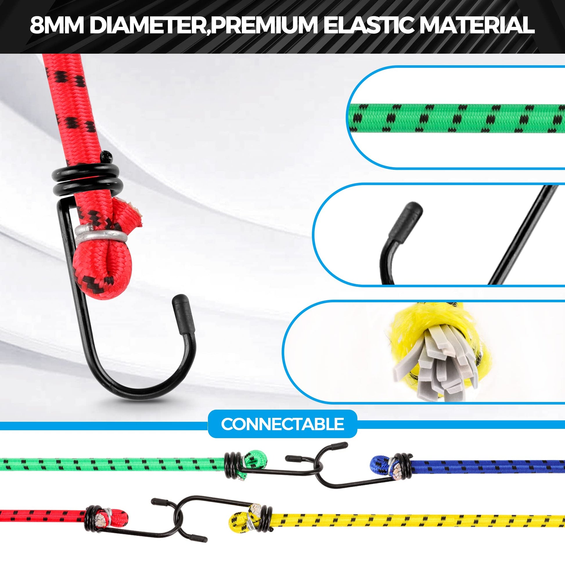 - 【High Quality】:Larger diameter of 8mm and super elastic natural latex inner core make this elastic bungee straps have a tensile force of 345N.