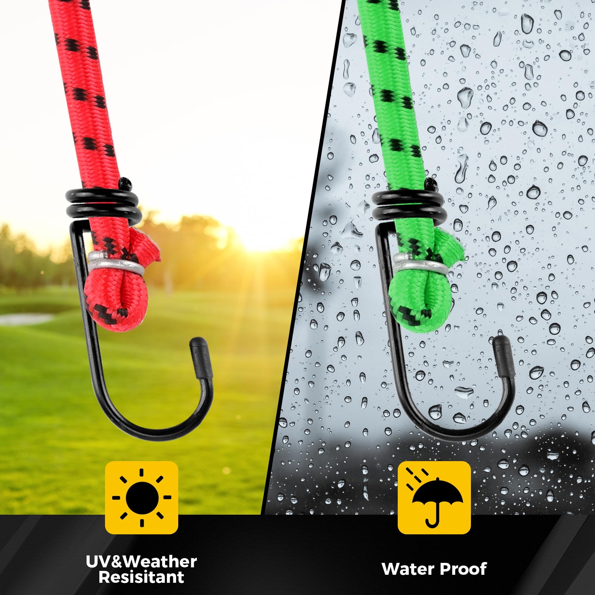 【Weather&UV Resistant】: Our elastic bungee straps are made of strong material and metal hooks so it is weather&UV