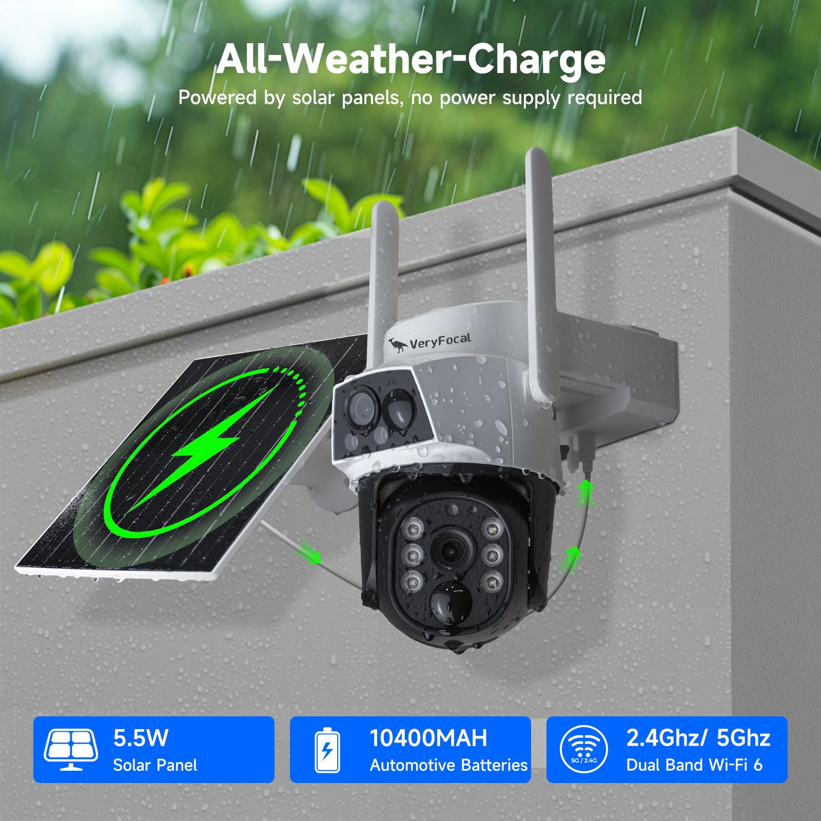 - Upgraded Solar Panel: Extra-large 5.5W high-efficiency solar charging panel, generates power even on cloudy, rainy, or snowy days, 10400MAH ultra-large automotive-grade rechargeable battery, WiFi6 Dual-Band, IP66 waterproof.