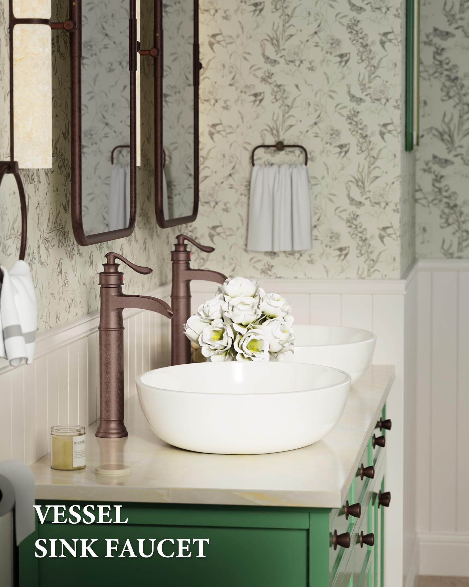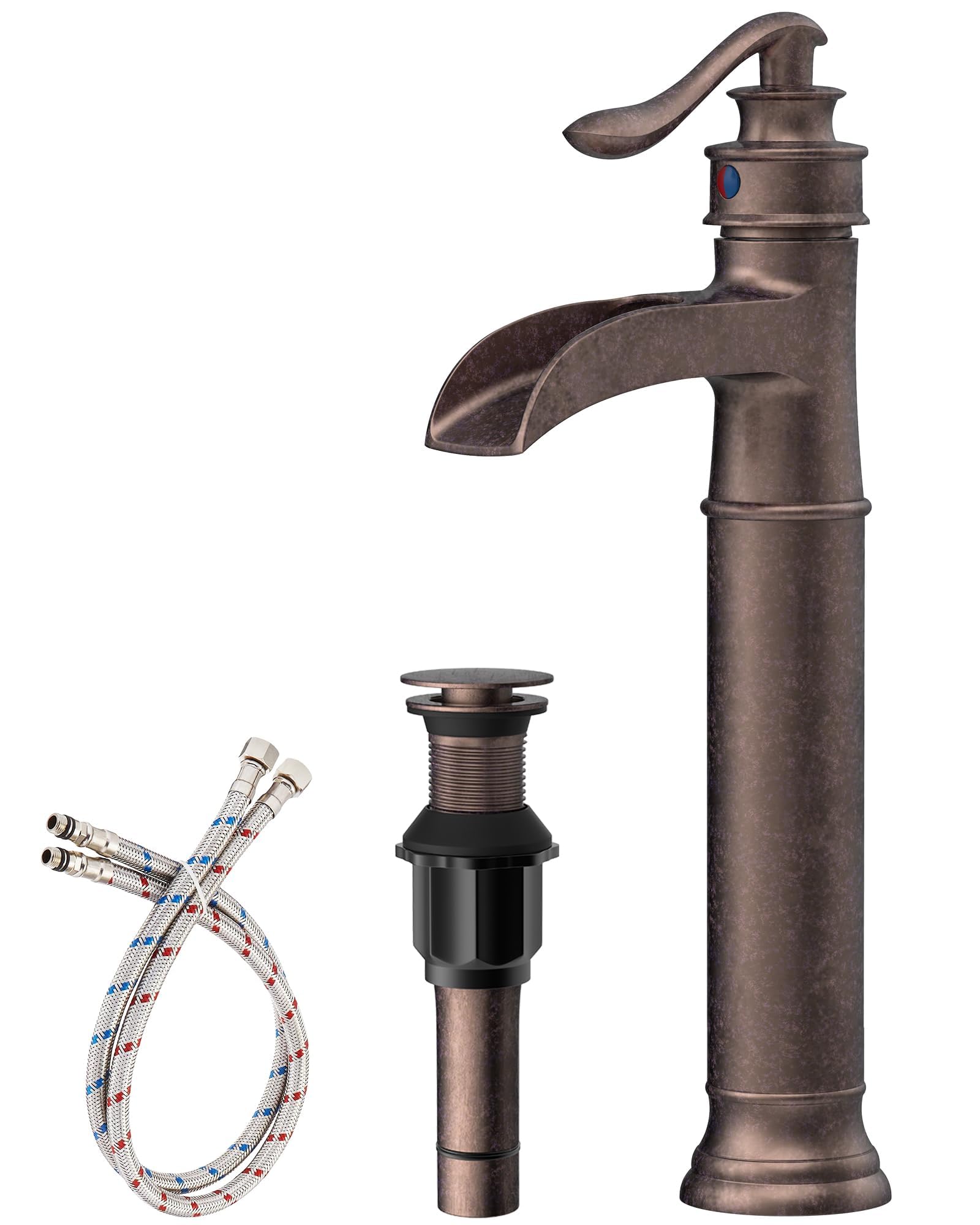 Vessel Sink Faucet Copper Tall Bathroom Faucets Waterfall Single Handle 1 Hole Farmhouse Antique with Pop up Drain Assembly and Supply Lines Mixer Tap Without Overflow Counter Top