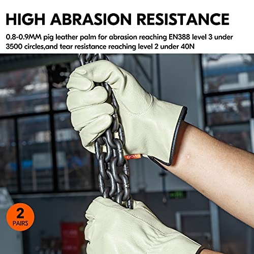 - MATERIAL - Carefully selected high-quality pigskin leather protecting hands from the hard environment in a wide variety of tasks. 0.8-0.9MM premium pigskin leather for abrasion reaching EN388 level 3 under 3500 circles,and tear resistance reaching level 2 under 40N