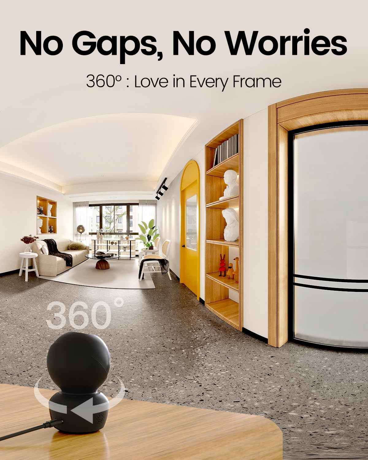 - 2.5K Live Stream & 360° Coverage — Experience stunning 2.5K resolution in live video or images that capture every detail of your home. The 360° panoramic design of the home camera indoor ensures comprehensive coverage of your living space, perfect for monitoring your family, baby, dog, puppy, or cat
