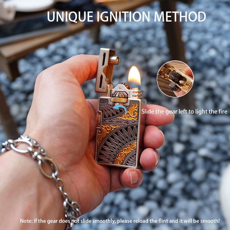 - Ignition method: Unique gear transmission structure, slide the gear to the left to ignite the flame. (If the gear does not slide smoothly, please reload the flint)