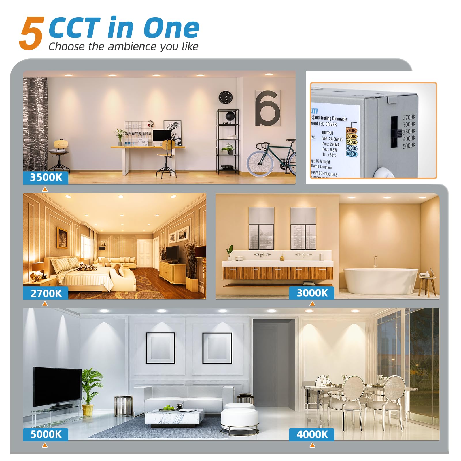 - 【5 Color Temperature】Just a slide on the side of the box, and choose 2700K/3000K/3500K/4000K/5000K-5 color temperature selectable to meet your mood, erasing the trouble of returning or replacing 7 inch led recessed light due to improper color temperature.
