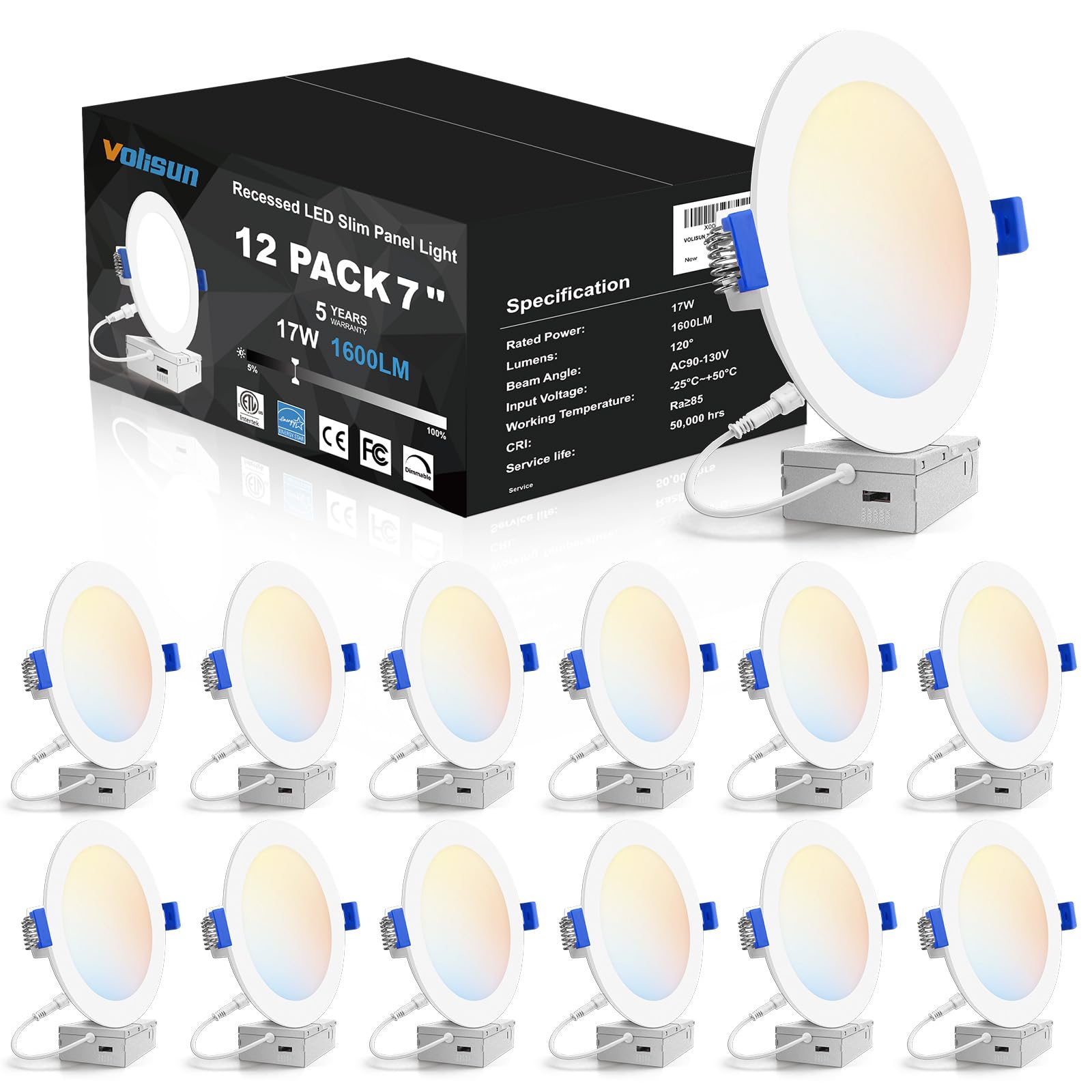 VOLISUN 12 Pack 7 inch Recessed Lighting, 5CCT LED Recessed Light with Junction Box, 2700K-5000K Selectable, Dimmable Canless Wafer Downlight, LED Ceiling Light ETL Certificated