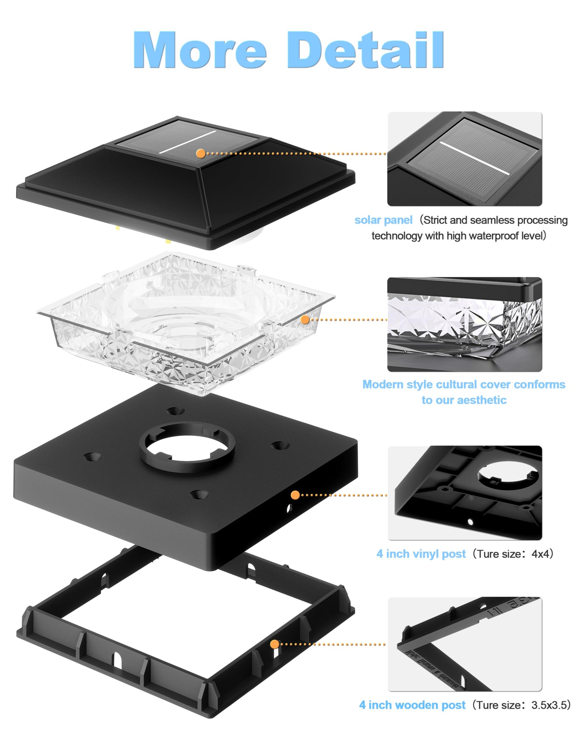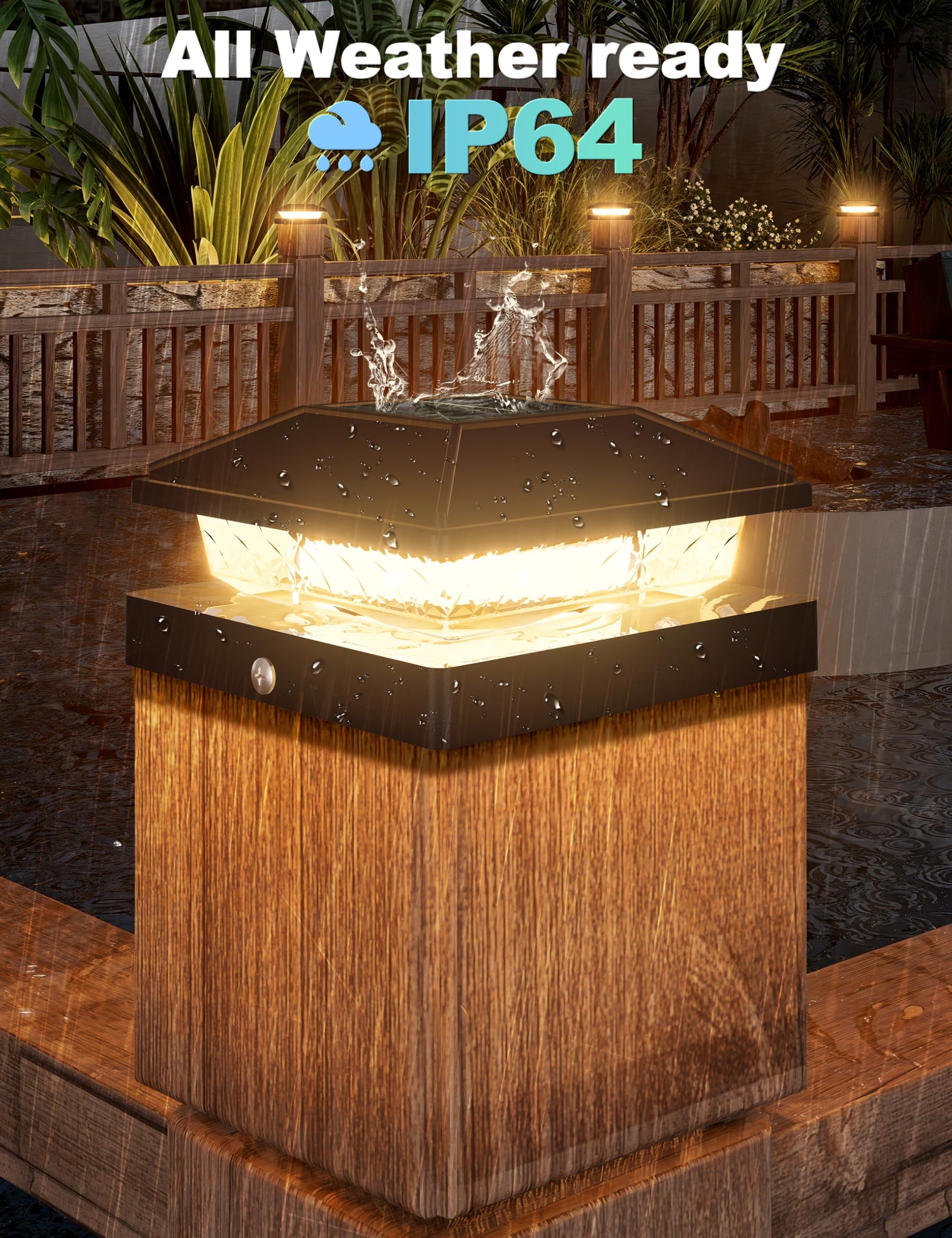 - 【IP64 waterproof】4x4 vinyl fence post solar lights have been upgraded with IP64 waterproof material, which it can withstand high temperature heat, pouring rain, snowstorm or any other outdoor environments. These 4x4 post cap of vinyl fence post cap lights protect your post from rain and sun to prevent premature rotting