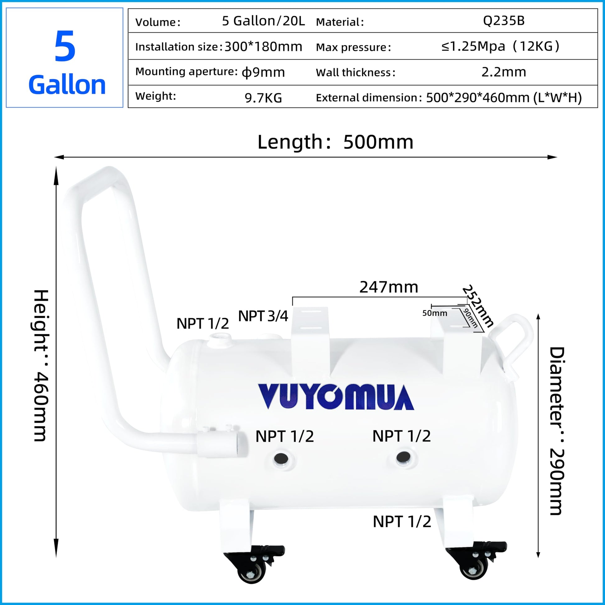 Details: VUYOMUA Air Tank designed for portability and easy to use,this portable air tank can go wherever you need it. More Air, Less Noise and Easy to Use,Wide range of applications, can be used in industrial production, automotive energy storage tanks, vacuum buffer tanks.The storage tank is used in conjunction with the connecting parts (trachea joints, plugs, safety valves, pressure gauges, drain valves), and can only work after debugging.