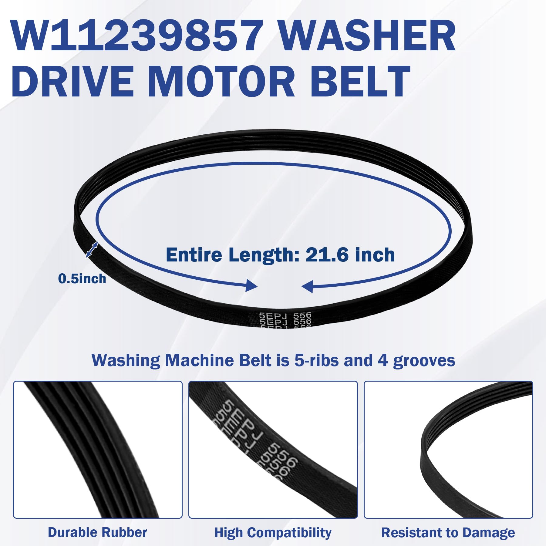 - Durable and Highly Compatible: W11239857 is made of durable rubber material and is a 5-rib, 21.6-inch-long drive belt specifically designed for certain models of top-loading washing machines. It is compatible with most mainstream brands of washing machines, including Whirlpool, Maytag, Amana, Kenmore, Crosley, and Ingersoll Rand.