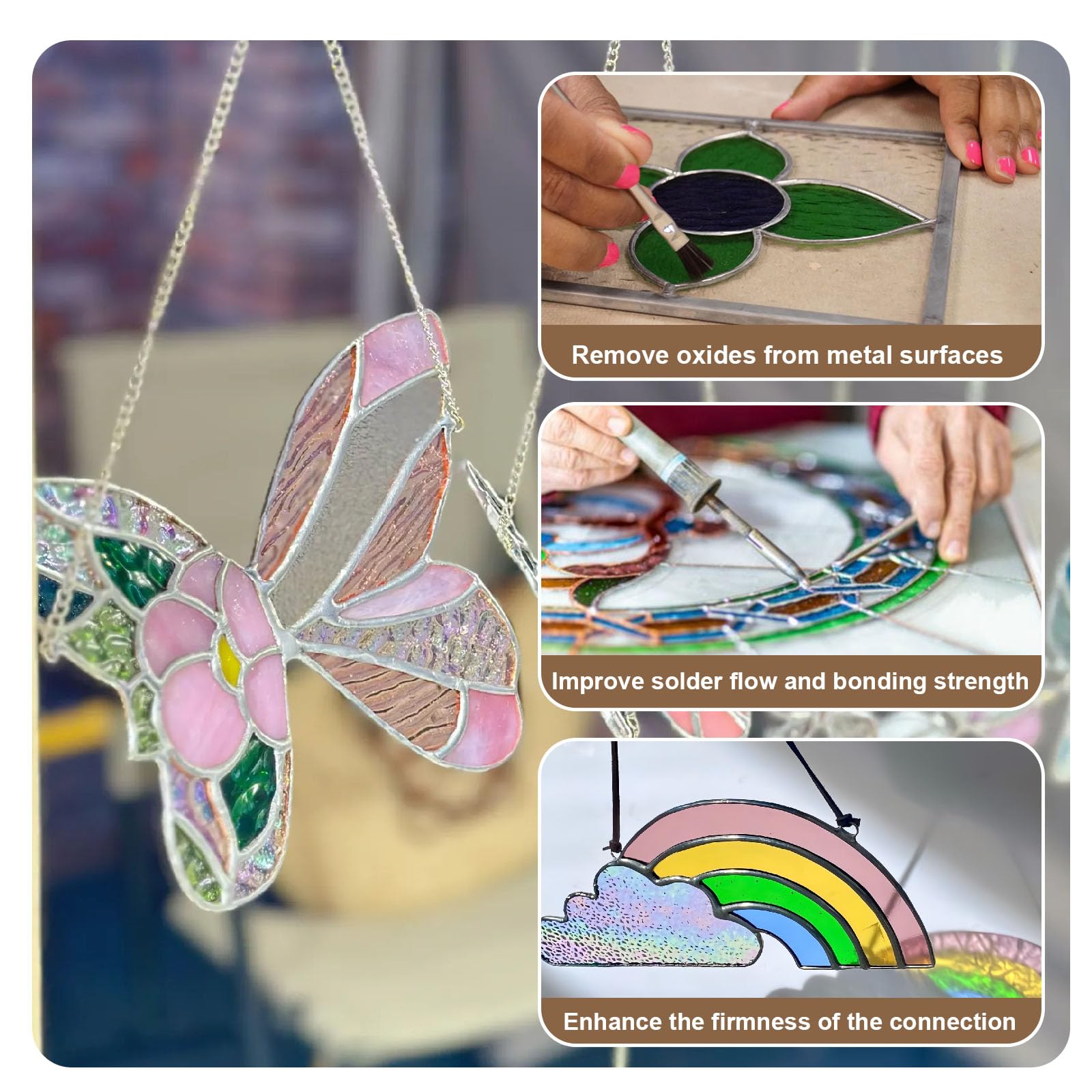 - What Will You Receive - Coming with a 4oz/100ml bottle, this stained glass flux is portable and easy to store. The included brush allows for precise application, effectively prevent the splash and burst. ensuring that the stained glass supply is evenly distributed on the welding surface for optimal results.