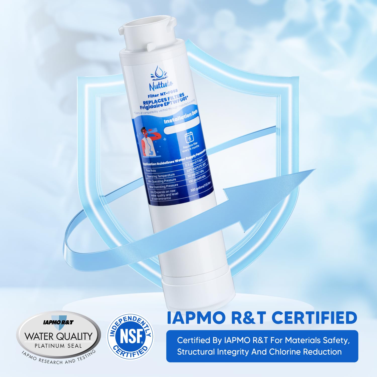 - NSF/ANSI Standard 42: The filter replacement compitable with Frigidaire is certified by IAPMO R&T against NSF/ANSI Standard 42 to remove chlorine, bad tastes and odors for crisp, bottled-quality water straight from your Frigidaire