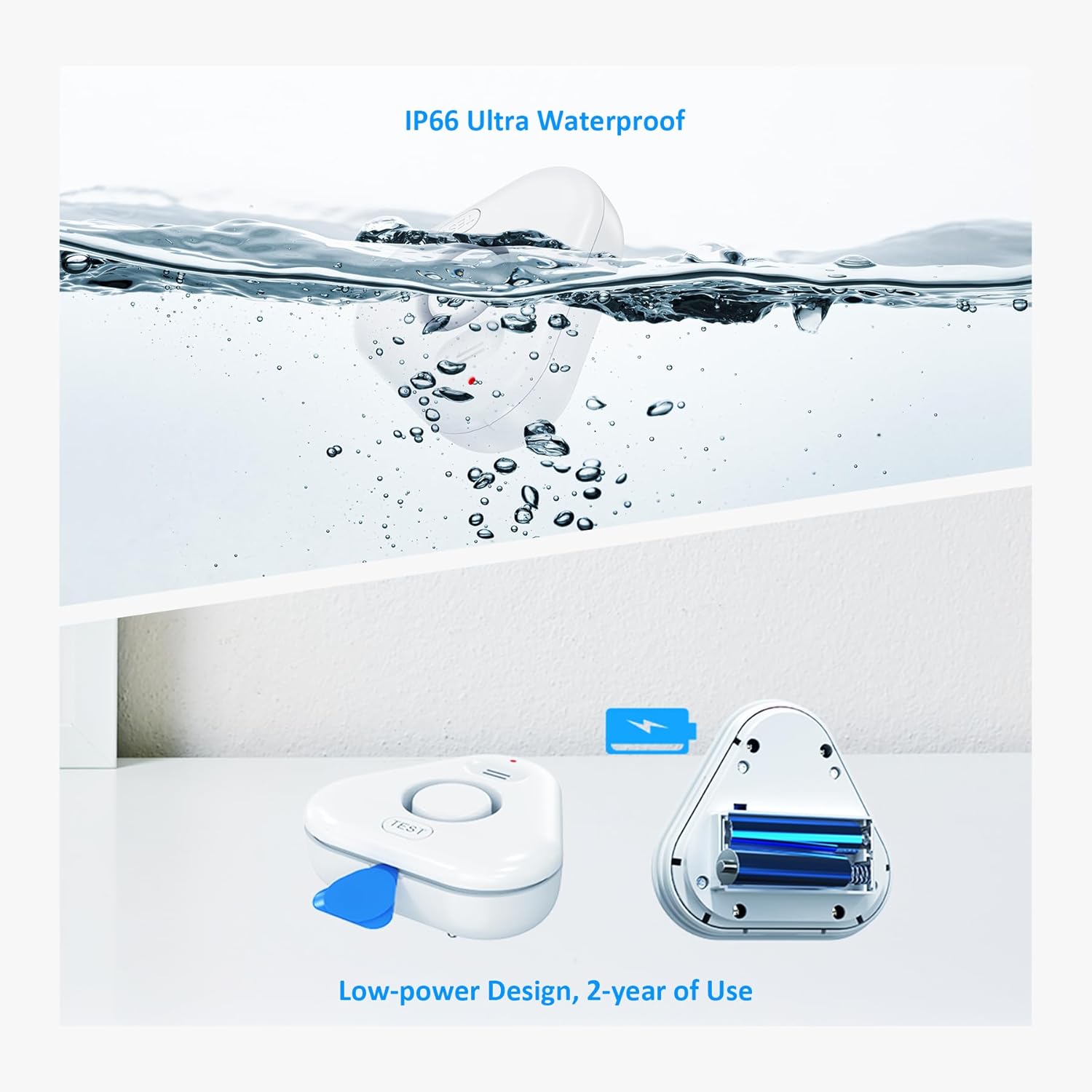 - 【Multi-scenario Application & IP66 Waterproof】The water alarm can be freely placed anywhere at home where you need to detect alerts of water leaks. You can place water sensor in the kitchen, sink, bathroom, laundry room, basement, etc. IP66 waterproof design allows for prolonged use in high humidity areas