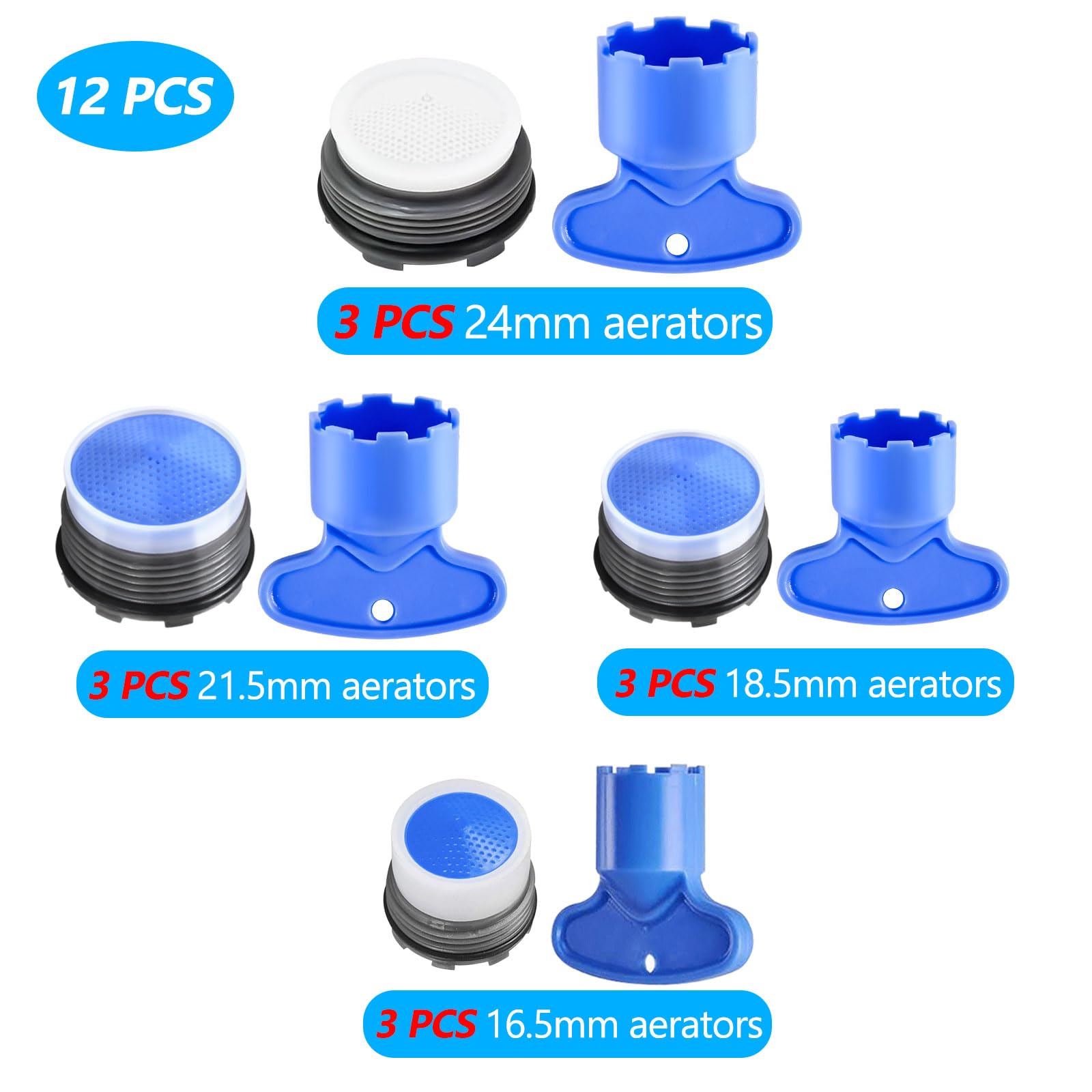 - 【Packing List】You will receive 12 PCS (including M16.5, M18.5, M21.5, M24) faucet aerators for kitchen bathroom sink aerators replacement and 4 keys. According to the different water quality in the area, for your water sanitation and safety, it is recommended to replace the aerator directly every 3-6 months.