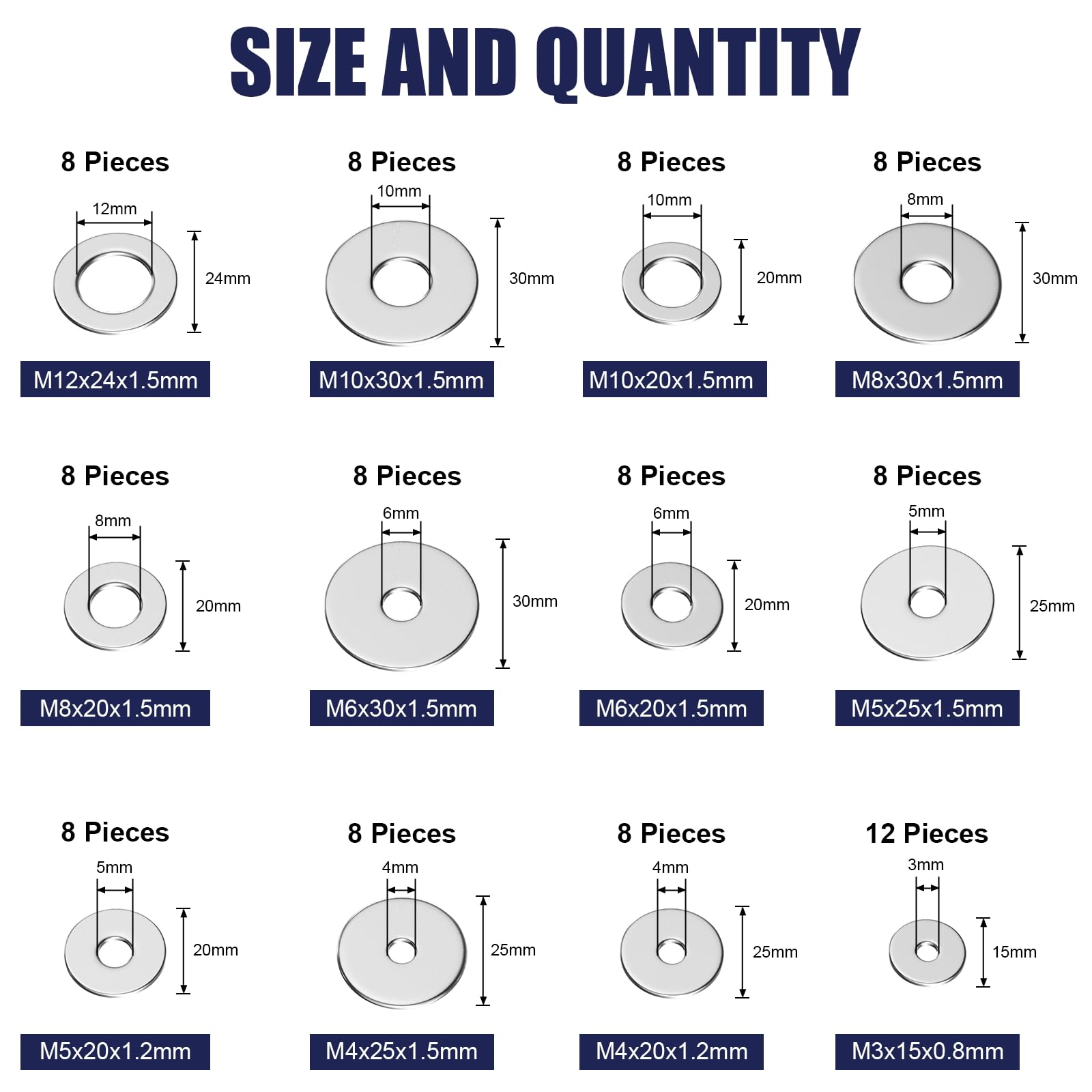 - 【Comprehensive Assortment Kit (M3-M12)】–This 100-piece washers assortment kit includes 12 different sizes ranging from M3 to M12, providing a complete solution for various uses like washers, flat washers, metal washers for screws and bolts in both home and industrial settings.