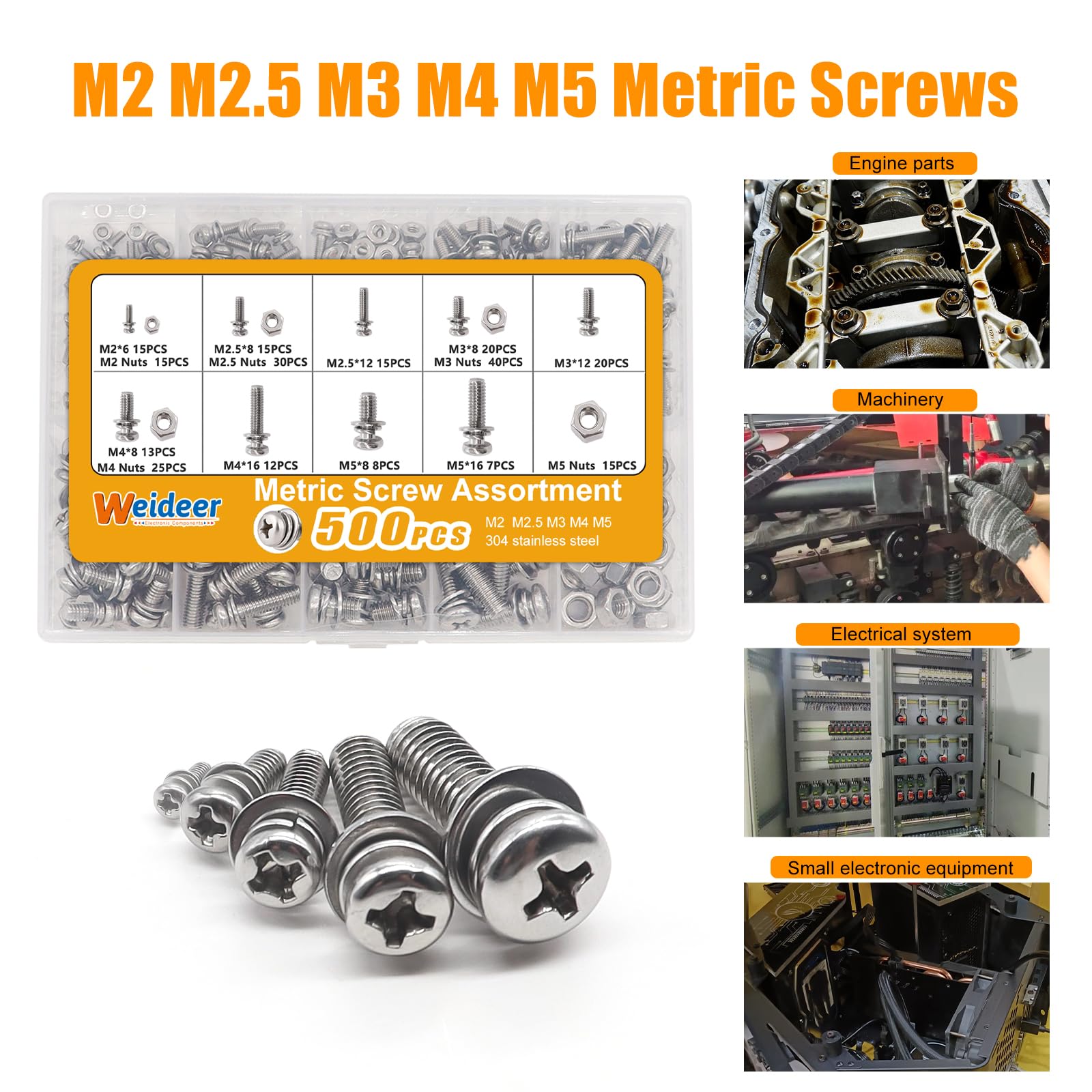 weideer 500Pcs Nut and Bolt Assortment Kit,M2 M2.5 M3 M4 M5 Machine Screws, 304 Stainless Steel Combination Screws for Electronics,Motorcycle,DIY Projects K-188
