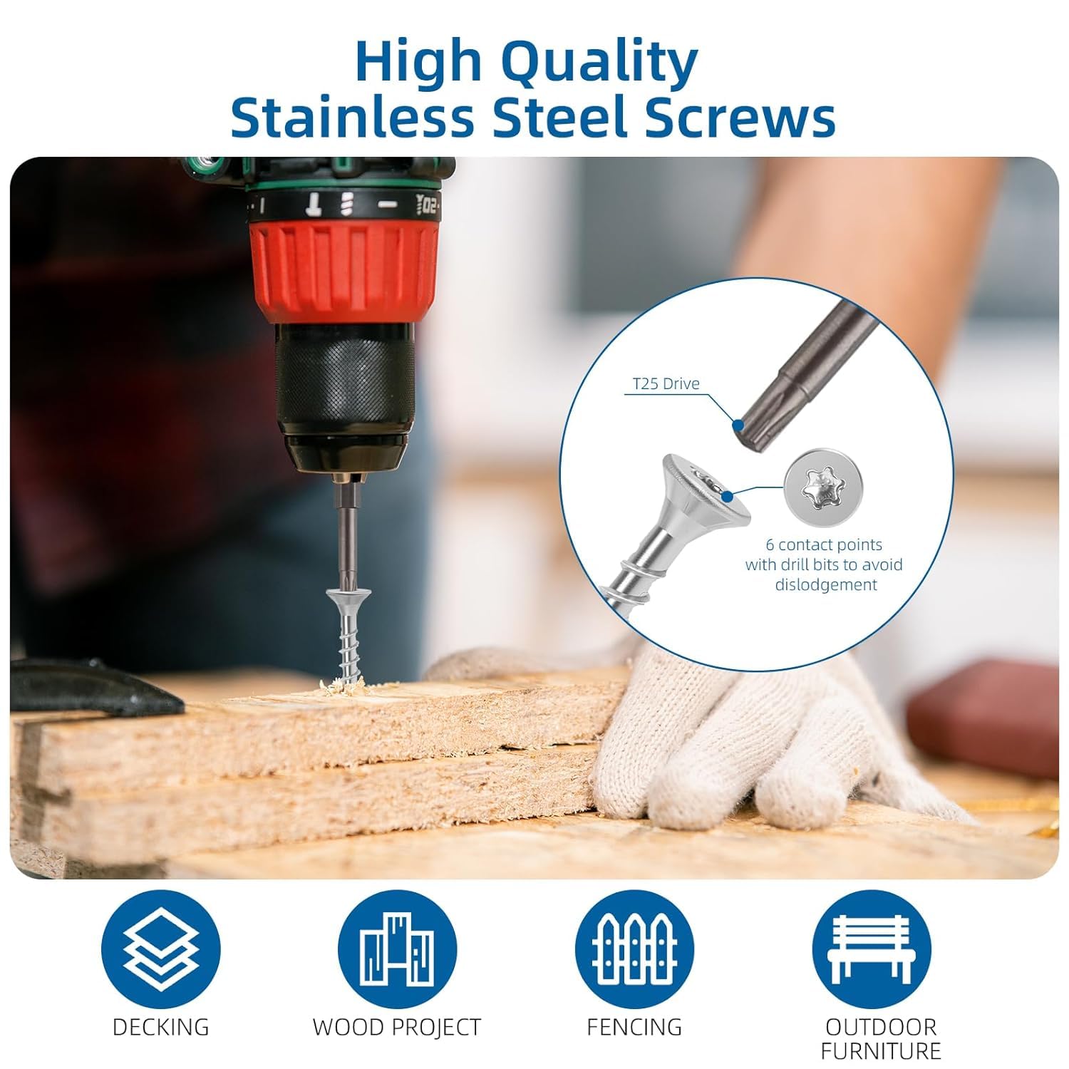 - Versatile Application Compatibility: Ideal for treated woods and composite decking, these screws are perfect for constructing decks, fences, and outdoor furniture. The aggressive thread design ensures fast penetration and strong hold, promoting secure and stable builds. Their durability makes them suitable for most outdoor conditions. Note: Not recommended for hardwood use