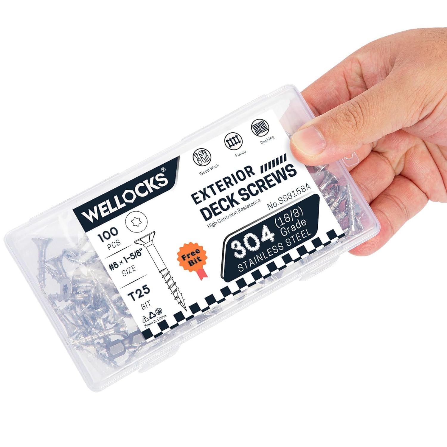 WELLOCKS Deck Screws 304 Stainless Steel #8×1-5/8" 100 PCS with T25 Star Torx Drive Flat Head Wood Screws High Corrosion Resistance for Outdoor Wood Fence(SS8158A)