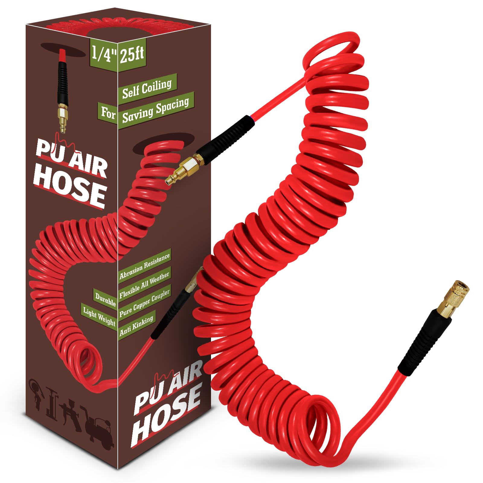 WHISPERING WONDER 1/4 in x 25 ft Polyurethane Air Hose with Bend Restrictor, Air Compressor Hose with 1/4 Solid 100% Pure Copper Quick Connect Fittings and I/M Plug Kit, Red