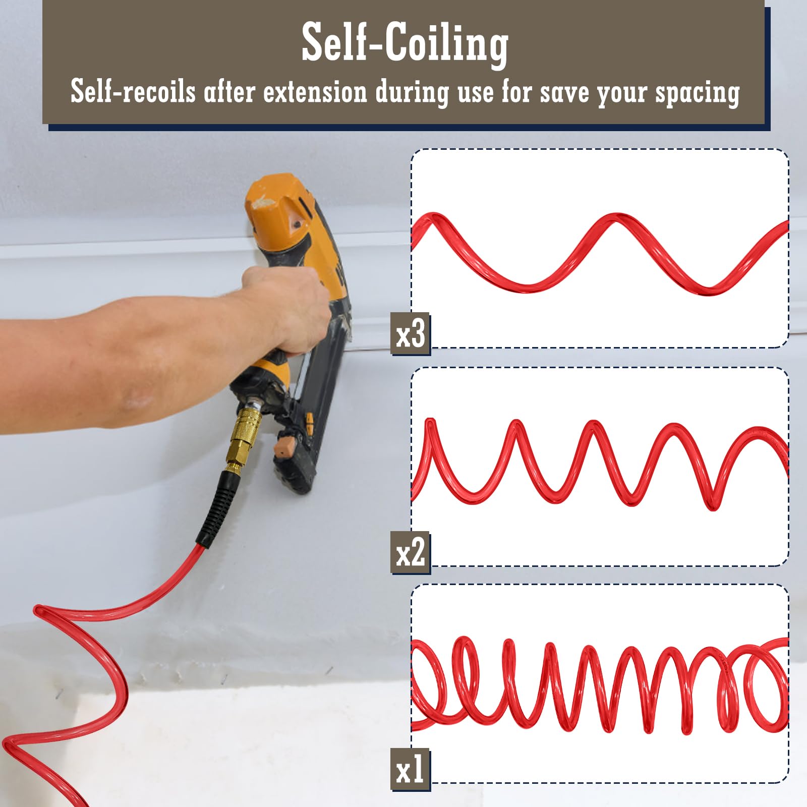 - HIGH PERFORMANCE OF RECOIL:Long recoil hose snaps back into shape, preventing kinks and tangles to aiding in wear resistance of hose, no more wasting time coiling your hose for storage. It delivers up to 150 PSI for maximum working pressure.Temperature range is -40 to 150 degree F.