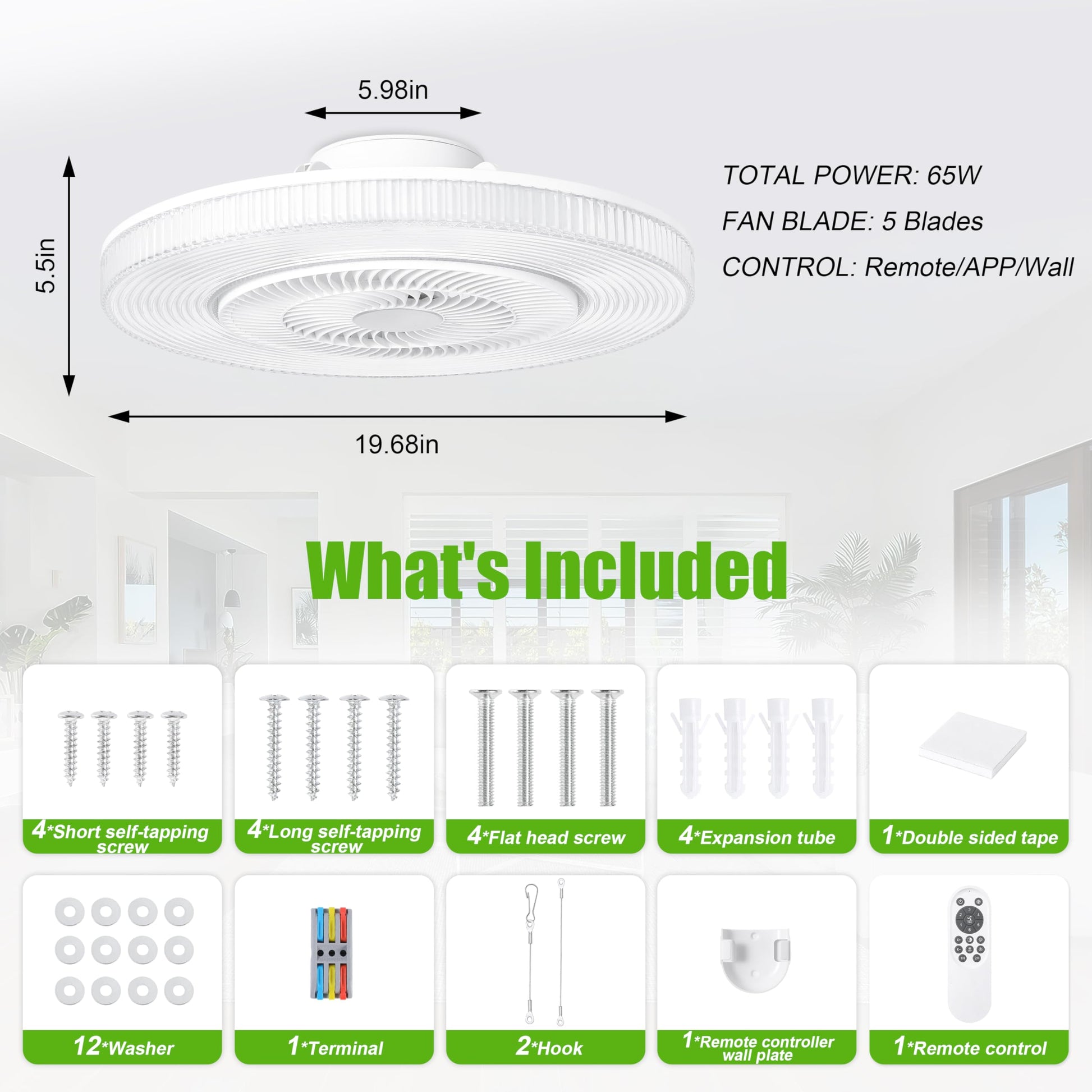 White 20" Modern Low Profile Ceiling Fan with Light and Remote, Stepless Color Temperature and Brightness Adjustable, 6 Wind Speeds, Suitable for Bedroom, Kids Room, Living Room and Study Room