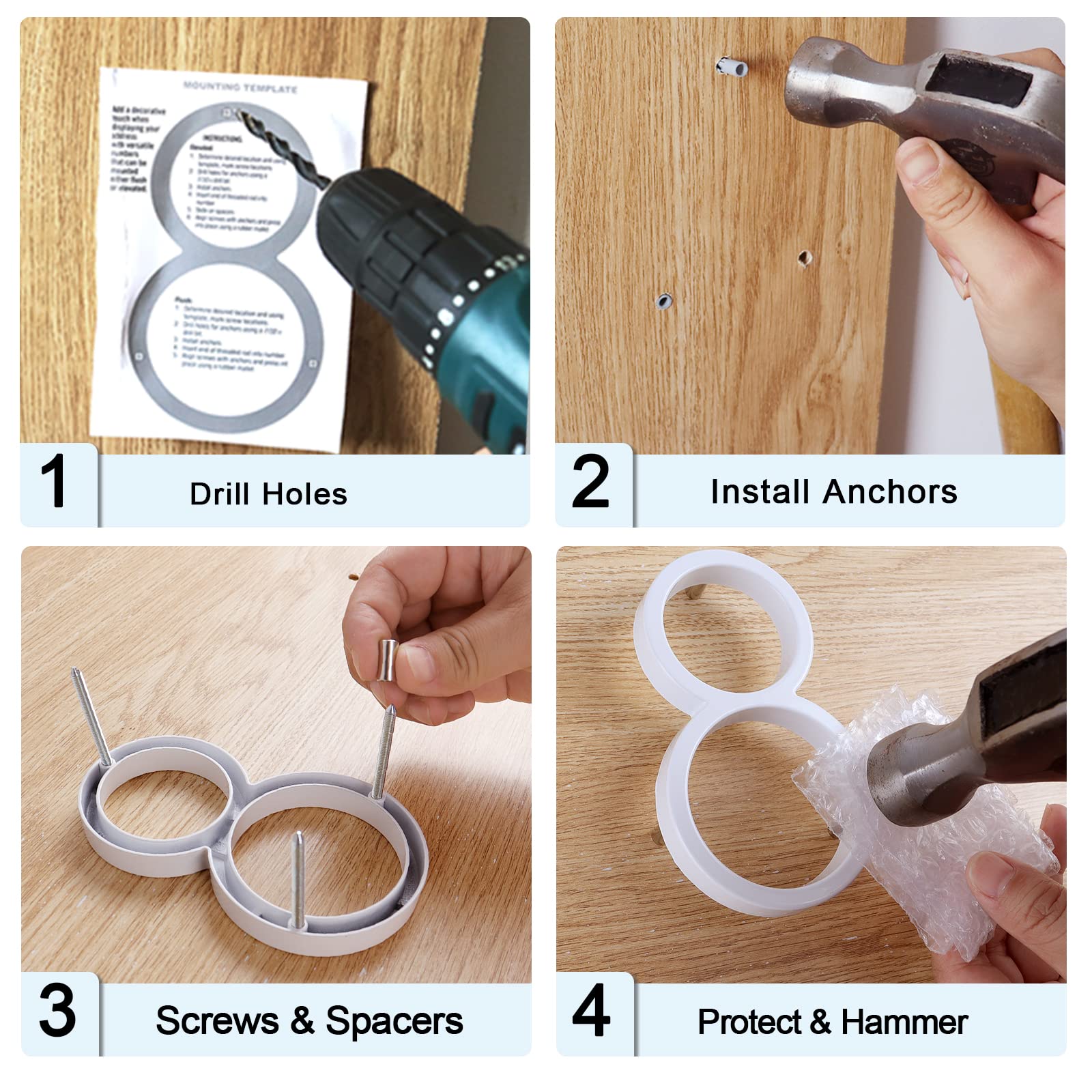 - 【Simple Installation】Our address plaque for house come with everything you need to install them: 3 mounting screws, 3 metal floating mounts, 3 anchors, and a diagram with instructions on where to drill the holes. You only need a drill gun to install them, and you can protect the outdoor house numbers by using the bubble bags as a cushion when hammering if you don't have a rubber hammer.