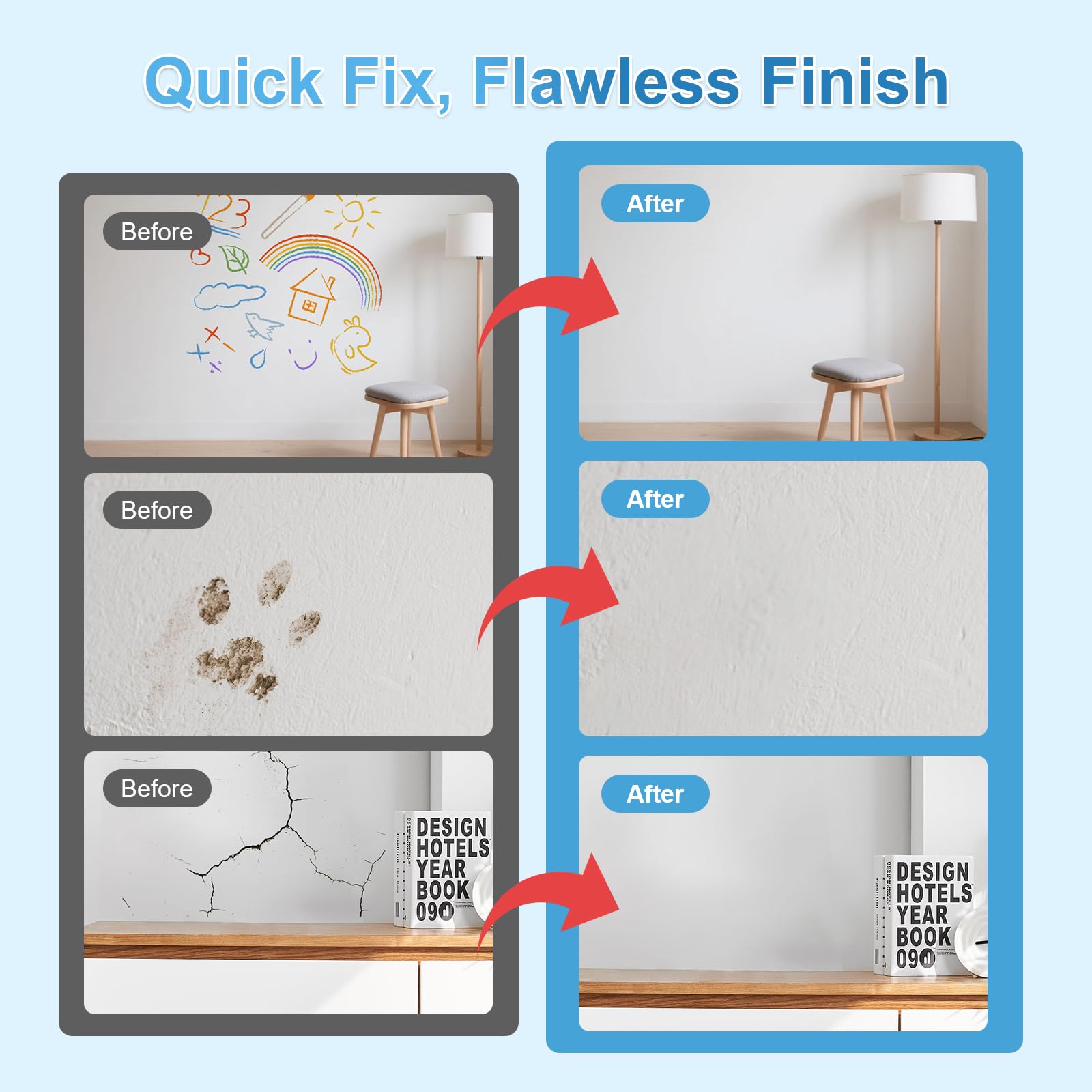 - Versatile Applications: Ideal for walls, ceilings, baseboards, and even outdoor touch-ups. Effectively removes common marks like shoe scuffs, pen graffiti, or ad residue. Whether you're renovating, decorating, or fixing accidental damage, this is your go-to wall repair solution.