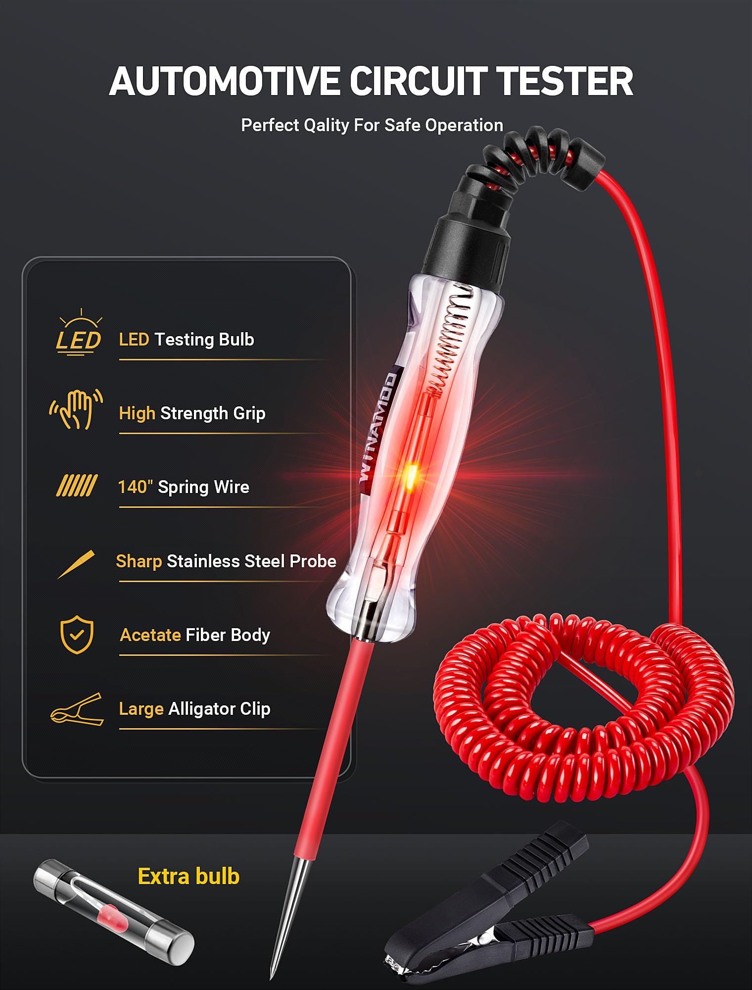 WINAMOO Professional LED Bulb Automotive Circuit Tester, 6-24V Test Light with Large Alligator Clip and 135IN PU Extended Wire, Light Tester Electrical Pen for Vehicle Circuits with Low DC Voltage