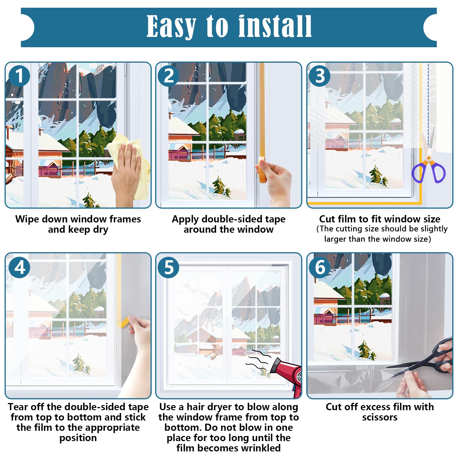 - Easy to Install: Before installing the window insulation kit, prepare a hair dryer and scissors, and clean and dry the area to be sealed in advance. Measure and cut the required film size, attach it to the window frame with tape, and blow hot air with a hair dryer for a period of time until the film becomes flat and adheres to the window