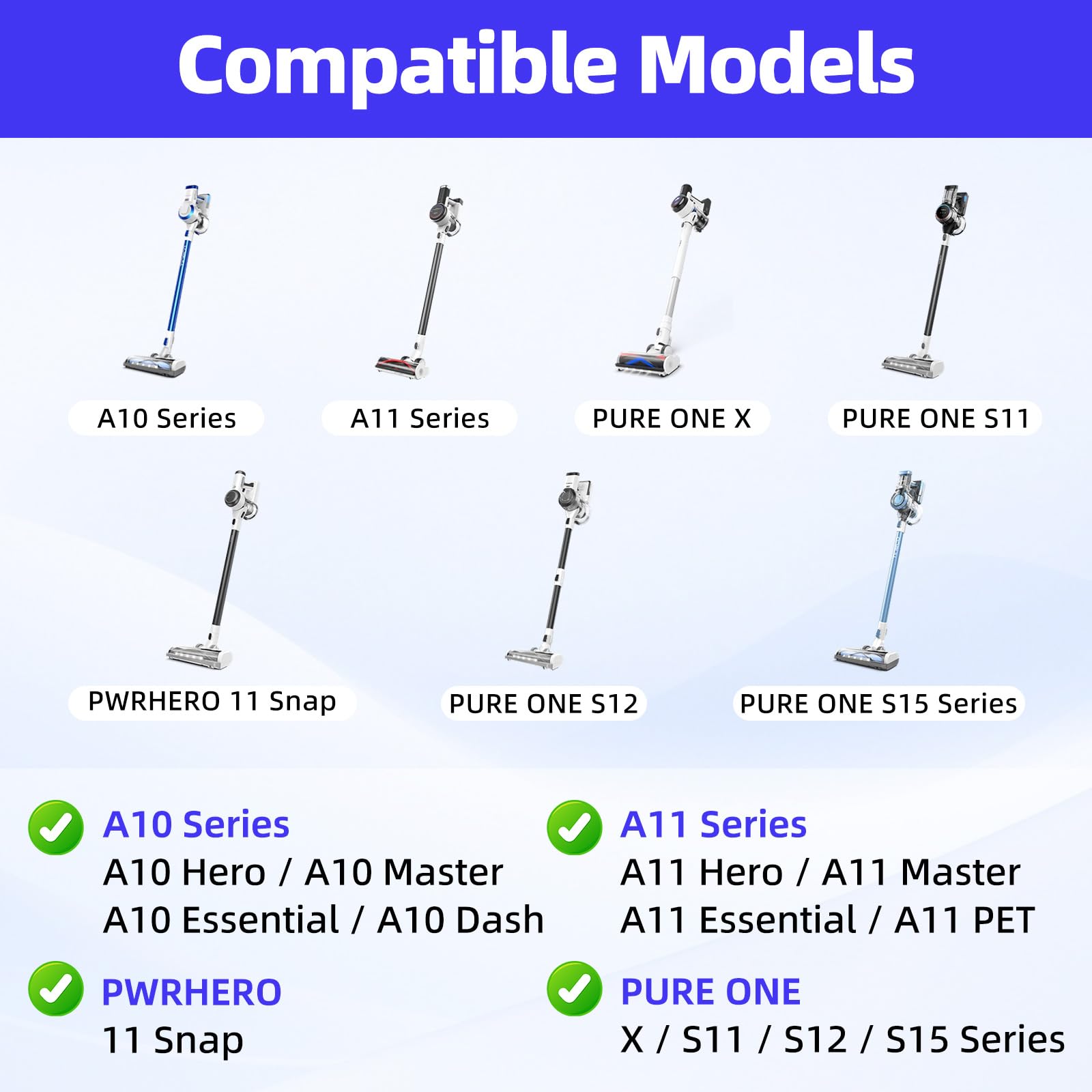 - ✅ Compatible Models: This kit is compatible with Tineco A10 Hero, A10 Master, A10 Essential, A10 Dash, A11 Hero, A11 Master, A11 Essential, A11 PET, PWRHERO 11 Snap, PURE ONE X / S10 / S11 / S12 / S15 Series Vacuum Cleaners. ⭐ This is a third-party compatible replacement part, NOT an OEM product.