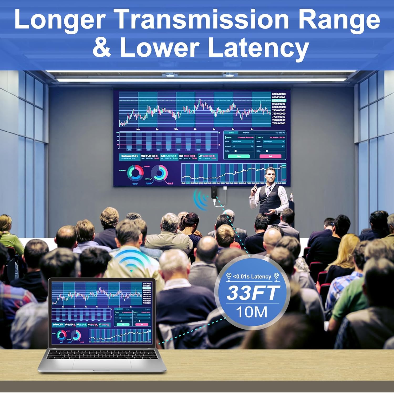 - Dual Band 2.4G/5G Wireless Transmission: Equipped with 2.4G/5G dual-band technology, this HDMI wireless receiver ensures stable and fast data transmission, with a range of up to 33ft (10m). The signal can easily pass through walls and obstacles, providing you with uninterrupted streaming and low-latency (<0.01s) performance