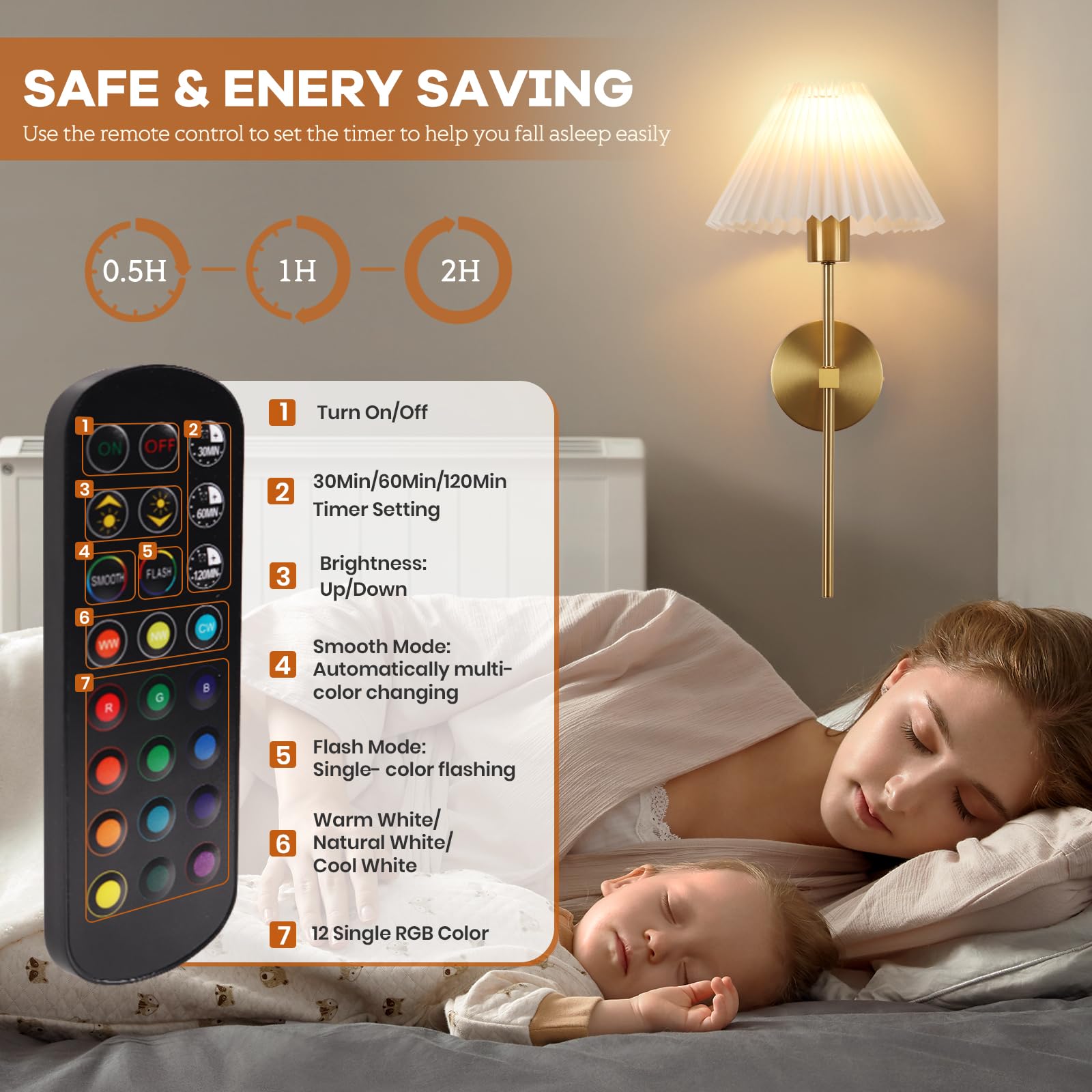 - 【Upgraded Wireless Multi-Function Remote Control】- Manage your lights effortlessly without having to leave your comfortable sofa or cozy bed, let you customize your lighting like a painter with their palette. Each wireless sconces offers 12 RGB colors and 2 dynamic modes, as well as 3 color temperatures (3000k/4000/5000K) to choose from,allowing for 10-level dimmable brightness (10%-100%),Whether it's cozy everyday lighting or a vibrant holiday party, our Wall Sconce wall decor set of 2 offers a full range of lighting options.