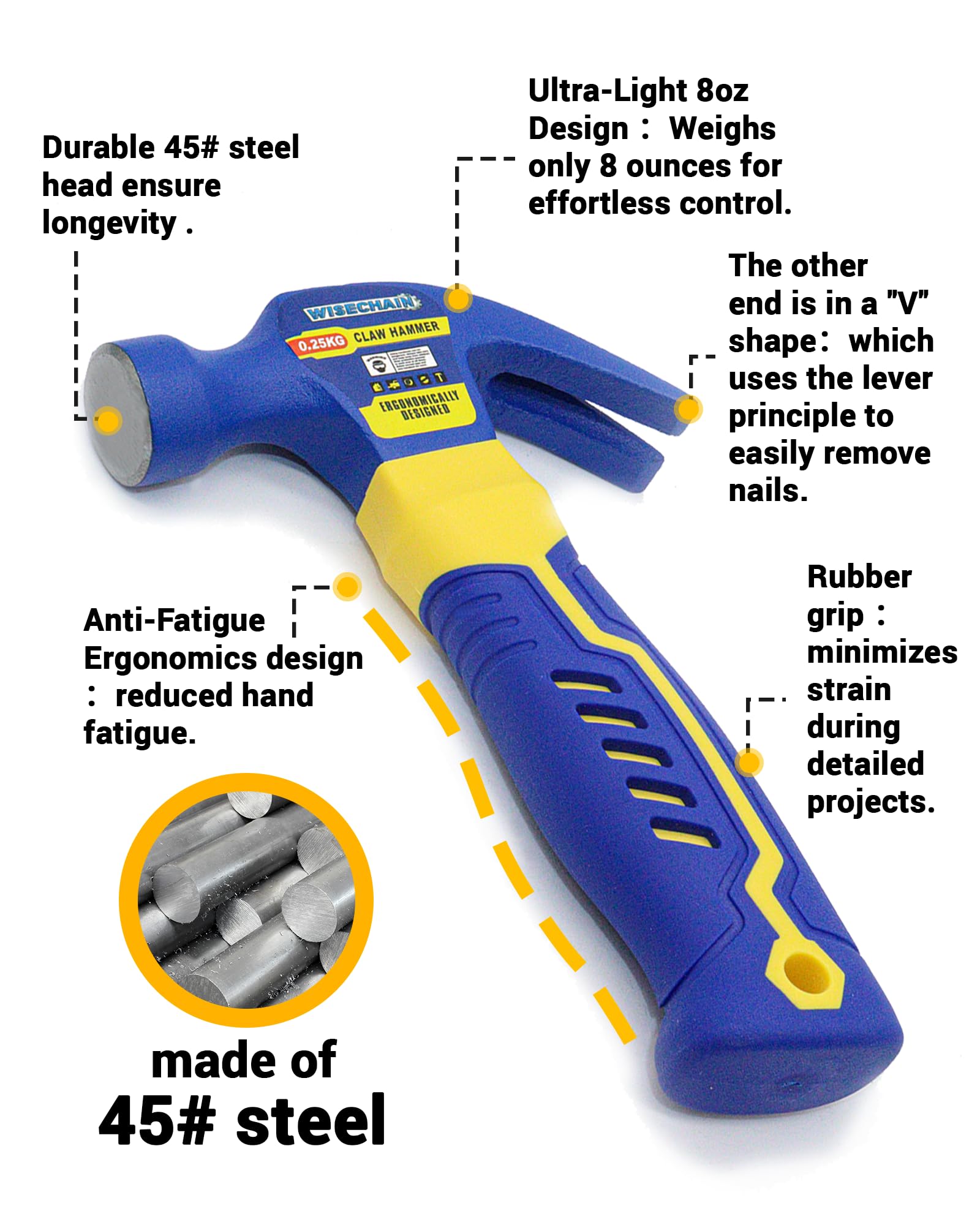 Wisechain 8 oz Professional Small Claw Hammer 45# Steel – Anti-Slip Grip & Nail Starter