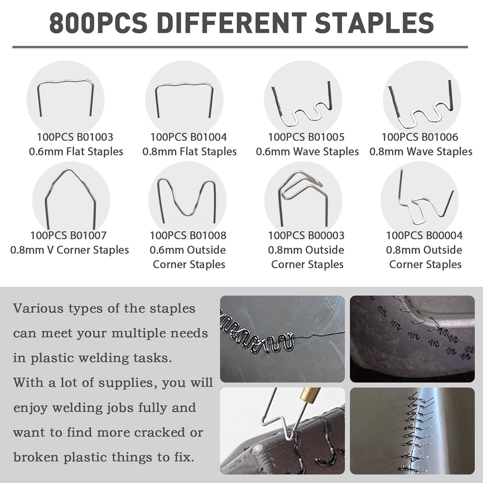 - 800PCS STAPLES -- Includes 0.6mm/0.8mm flat staples, 0.6mm/0.8mm wave staples, 0.8mm corner staples, 0.6mm outside corner staples, 0.8mm 01/02 outside corner staples. Meet your needs in repairing different plastic surface.