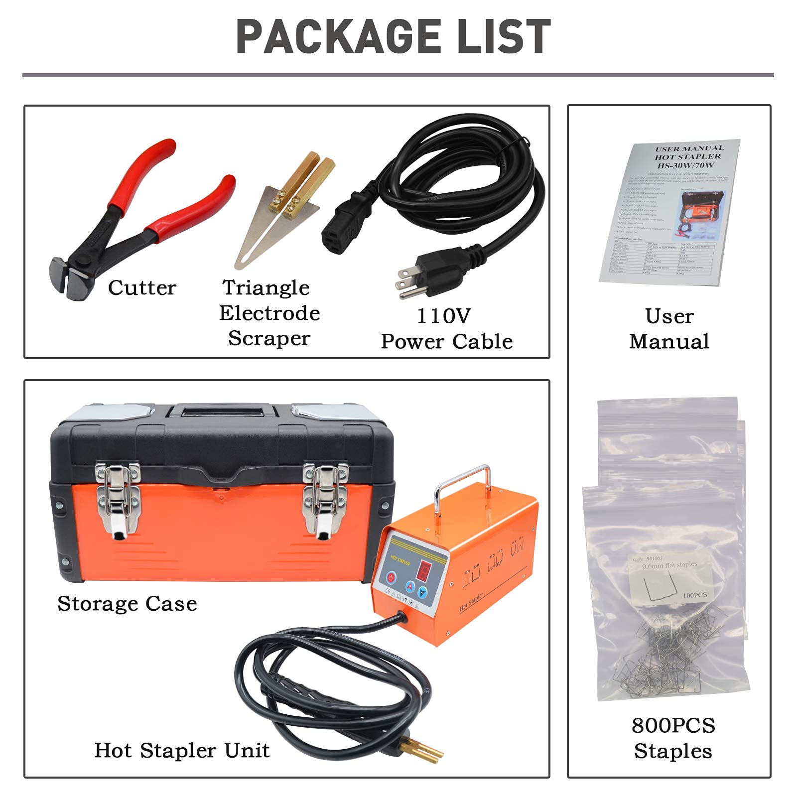 - WHY CHOOSE IT -- The hot stapler plastic welder repair kit features Digital Display Screen, 5 adjustable heating levels, a LED light in the handle, includes triangular electrode scraper, cutter, 110V power cable, 800PCS staples and user manual, all stored in a decent case.