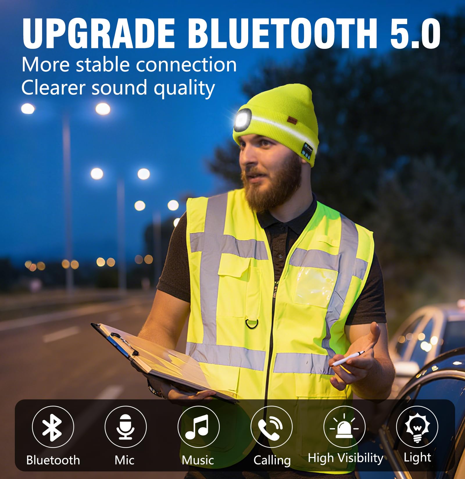 - HIGH-VISIBILITY REFLECTIVE STRIP: Engineered for after-dark safety, this bluetooth beanie is designed with 360° reflective stripes that ensure you’re visible from every angle—dramatically enhancing security during any nighttime activity. The LED light illuminates your path in the dark, giving you more peace of mind when walking or working outside with your music or calling.