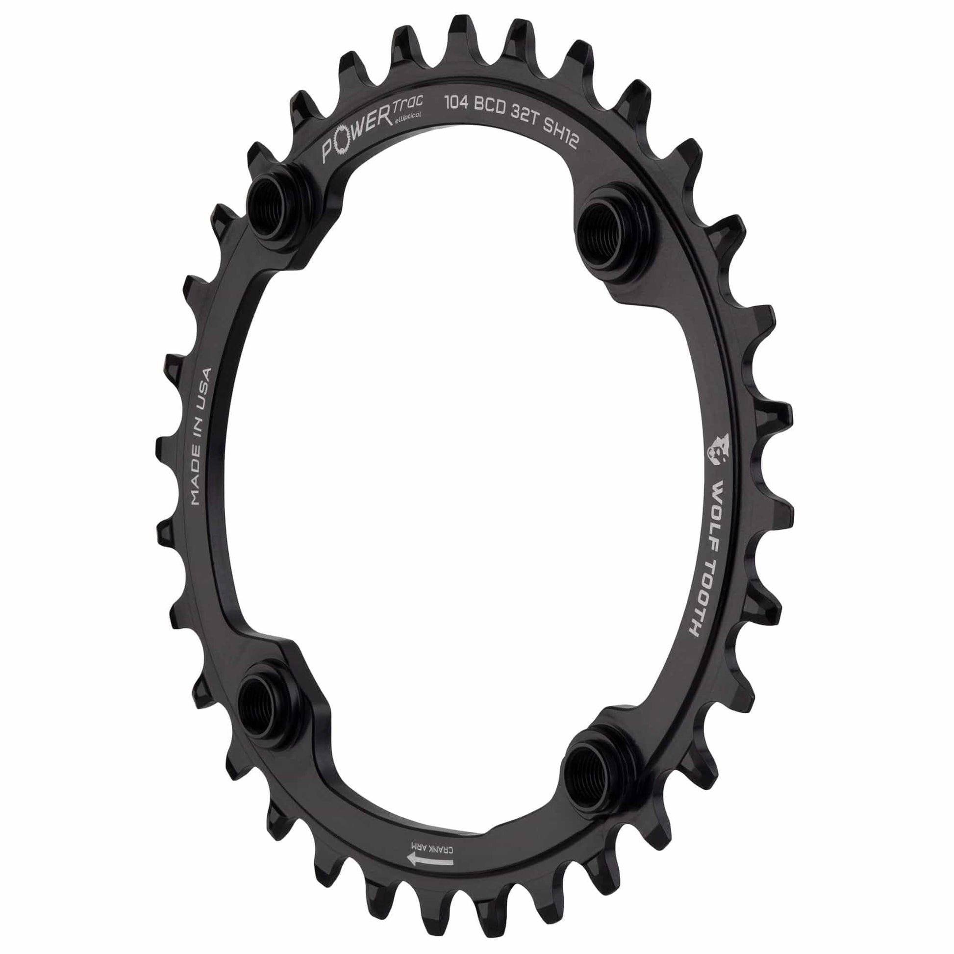 Details: PowerTrac Elliptical (PTE) Oval Chain Ring for MTB 104BCD Crank for Shimano 12speed Unique design makes this an oval ring that provides the benefits of a dead point of 112 degrees after 10% (ellipse ratio) timing. Eliminates rolling down in the "power zone" and allows natural pedaling in the "recovery zone". Wolf Tooth's patented chainring. The wide side of the teeth has maximum contact on the drive side, which disperses the load to extend the life of the chainring. Narrow side allows for mud and debris clearance to reduce friction Alternating wide and narrow tooth patterns to prevent chain from dropping Compatible Standards: Shimano 12 Speed Hyperglide + Chain Drop-Stop A; Voltage: M8 Chainring Bolts Compatible (Threaded) Weight: 1.6 oz (48 g) Drive Train: 1 x 12 (Shimano) Material: 7075-T6 aluminum Chainline (approximate): Triple Crank: 1.9 inches (48 mm), Double Crank: 1.9 inches (49 mm).