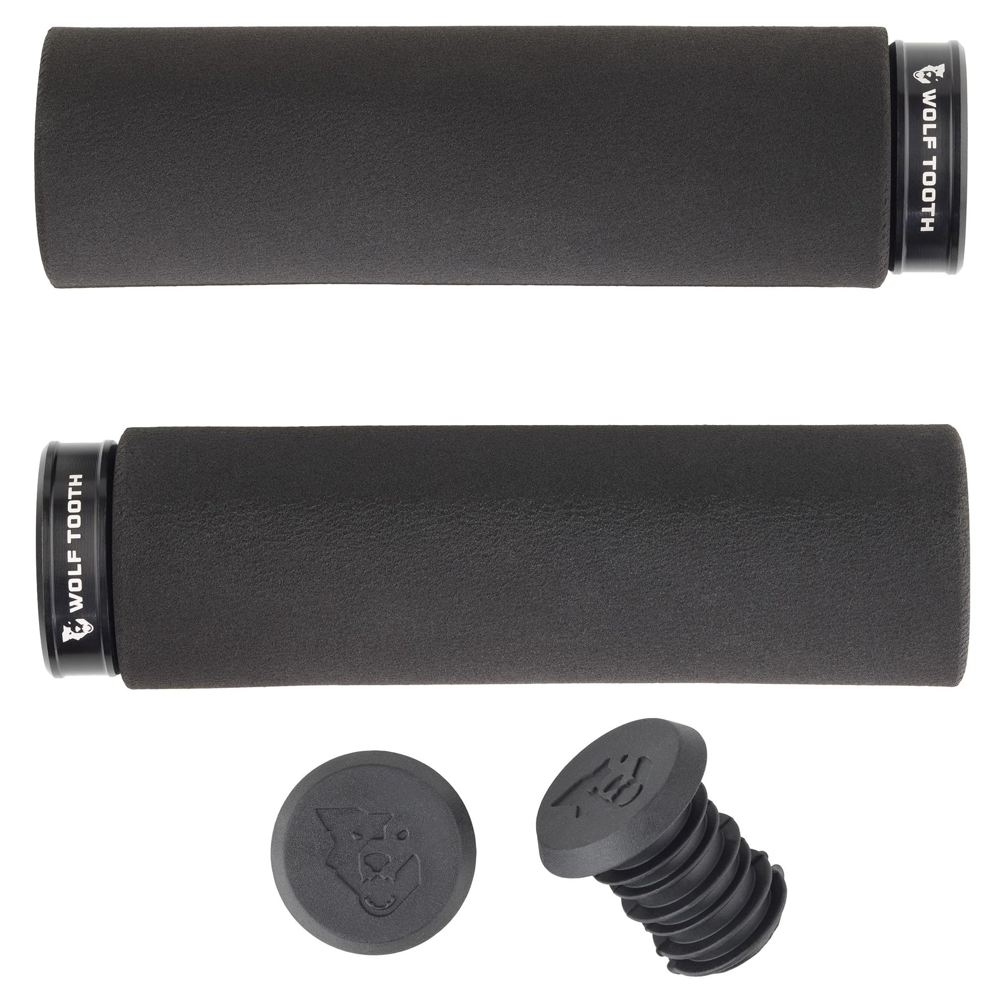 Details: Fat Paw Lock-On Grips bring the same texture and feel of the popular Fat Paw silicone foam grips to the lock-on grip format. This means that they are comfortable, easy to install, and have excellent vibration-damping qualities. The installed diameter of Fat Paw Lock-On Grips is the same as the Fat Paw silicone foam bike grips, at 36mm. They are compatible with all standard mountain bike handlebars. Grips are made with black silicone foam and come with anodized aluminum collars that match the eight primary colors of other Wolf Tooth anodized accent pieces. Includes Wolf Tooth plastic bar end plugs. Upgrade to matching Alloy Bar plugs or store tools in your handlebars with the Wolf Tooth EnCase System. - 132mm long and 36mm diameter - Bolt in collar is tightened/loosened via 3mm hex wrench - All pieces are available as replacement parts via Wolf Tooth's Right to Repair program Compatibility - Compatible with standard 22.2mm mountain bike handlebars Tech Specs - Weight: 153g pair - Dimensions: 132mm long, 36mm diameter - Material: silicone foam grip on a rigid plastic liner, 6061 aluminum clamp - Tool Required: 3mm hex wrench - Max Torque: 2.5 Nm