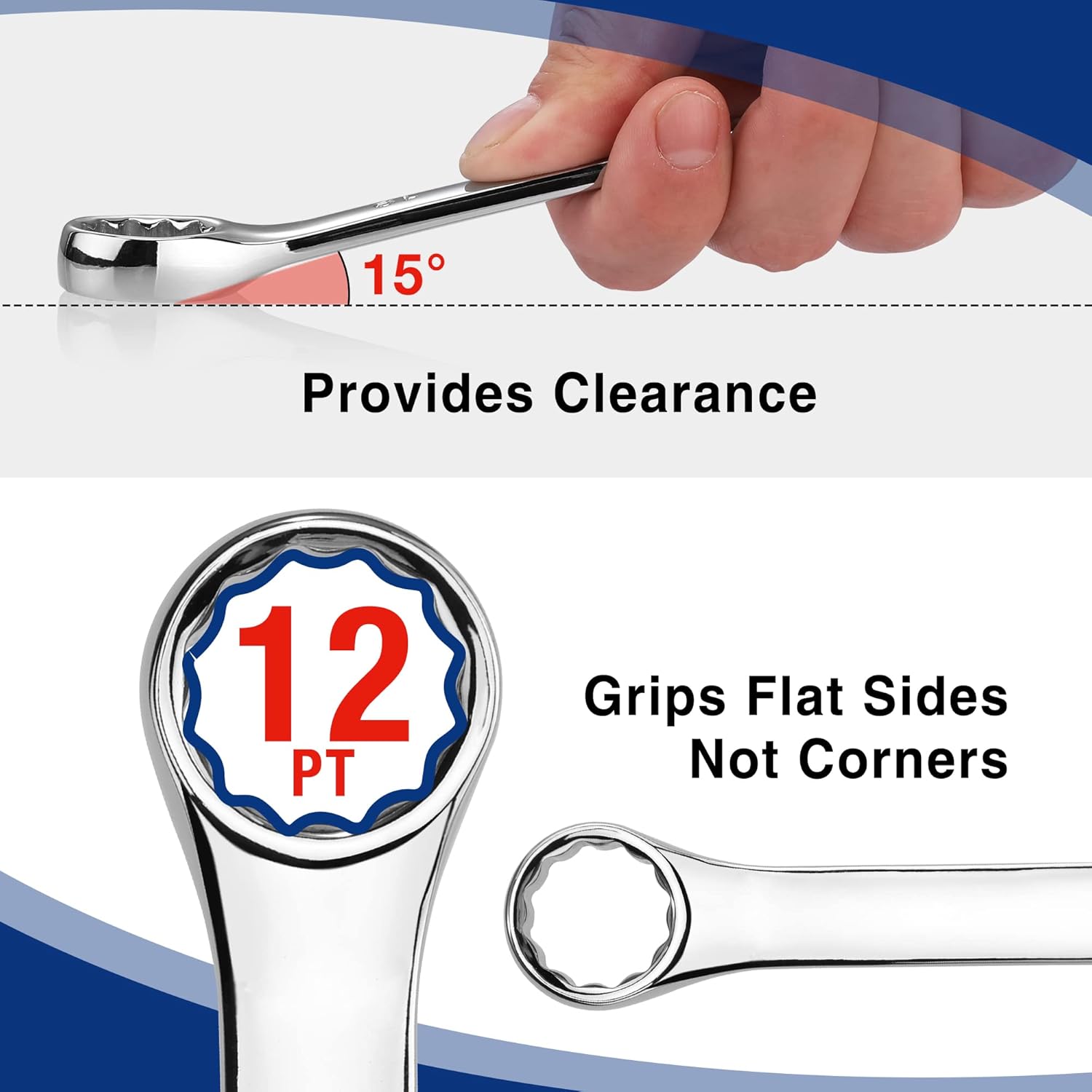 - EFFICIENT WRENCH: These combination wrenches are set up with a 12-point box end, which doubles the access angle to a 6-point, box end opening is designed to grip flat sides of fastener heads, not corners to prevent round-off