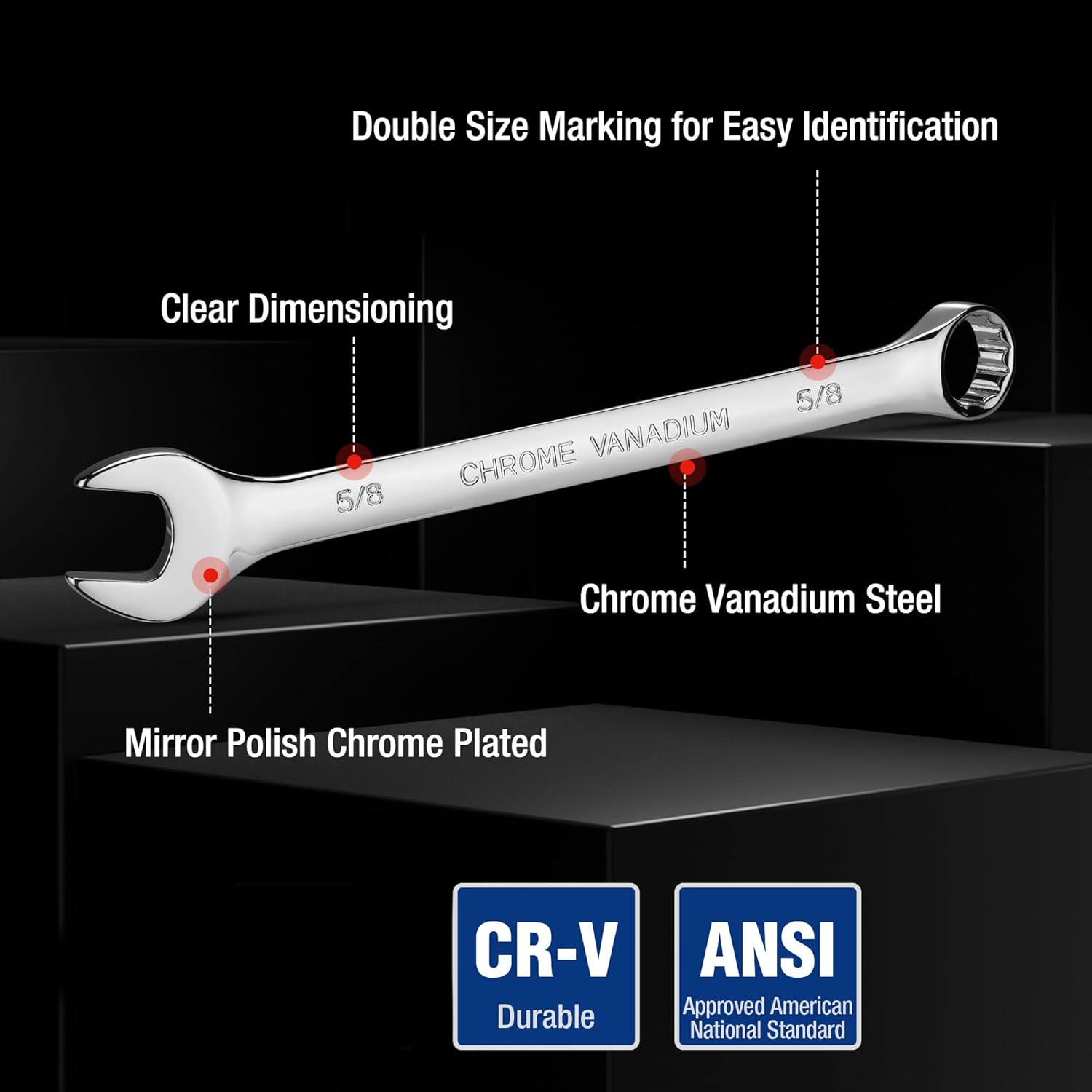 - 32 PC HIGH QUALITY WRENCH SET: 10-piece SAE- 1/4", 5/16", 11/32", 3/8", 7/16", 1/2", 9/16", 5/8", 11/16", 3/4" and 10-piece Metric- 6, 7, 8, 9, 10, 12, 13, 15, 17, 18mm; 6-piece Stubby SAE- 5/16", 3/8", 7/16", 1/2", 9/16", 5/8" and 6-piece Stubby Metric- 10,11,12,13,14,15mm. A wide variety of tools for the best possible results