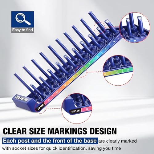 - Clear Size Identification: Each post features size markings for quick identification of socket sizes, saving you time on projects. The dual-track design allows simultaneous storage of long and short sockets, providing versatile organization for your tools