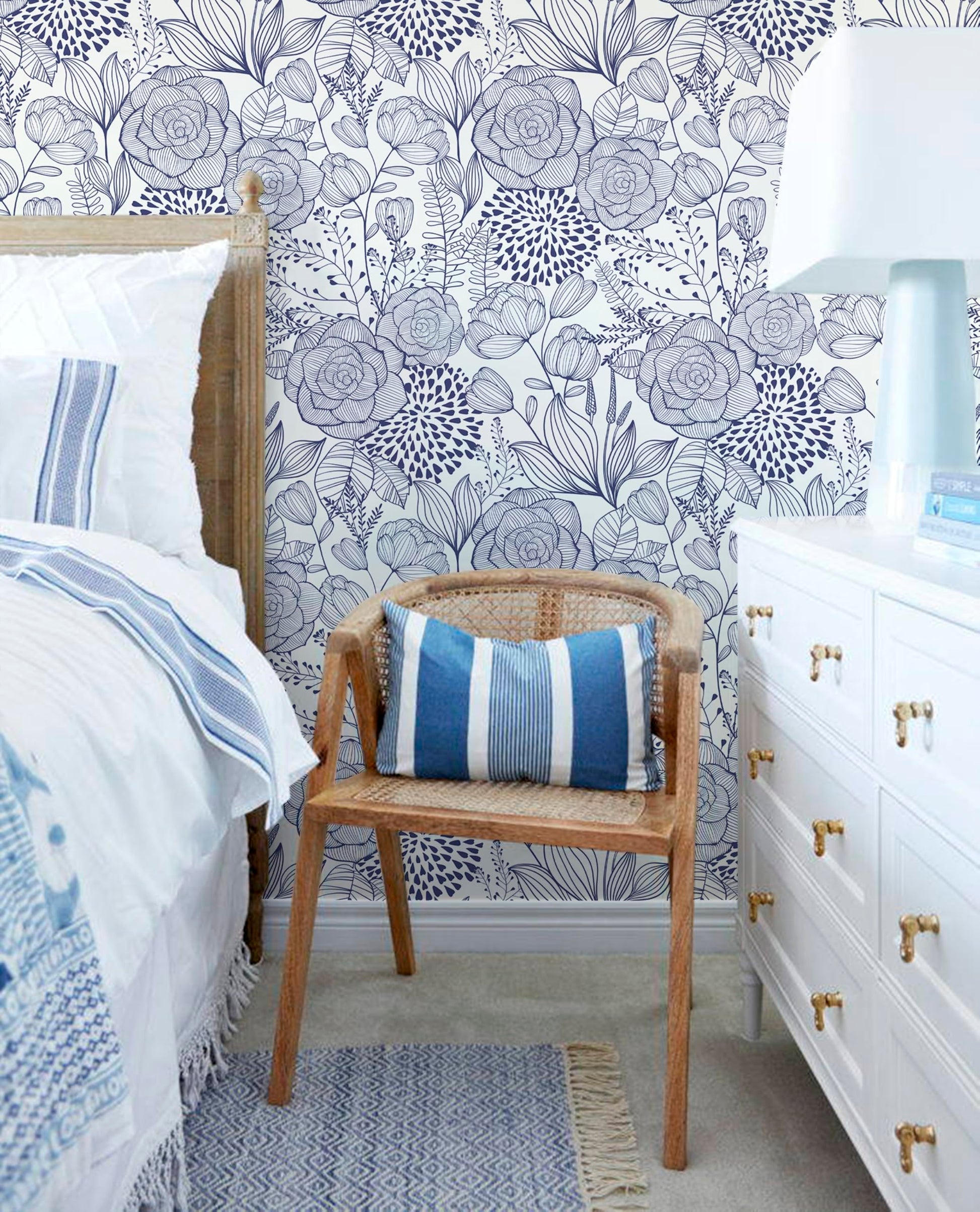- Floral Peel and Stick Wallpaper【UNIQUE DESIGN】Floral wallpaper features a pure white background with blue lines outlining floral and plant designs, giving the impression of being in a garden full of flowers. Its vintage style and elegant charm can easily blend into various types of environments, bringing a unique charm to the boring space.