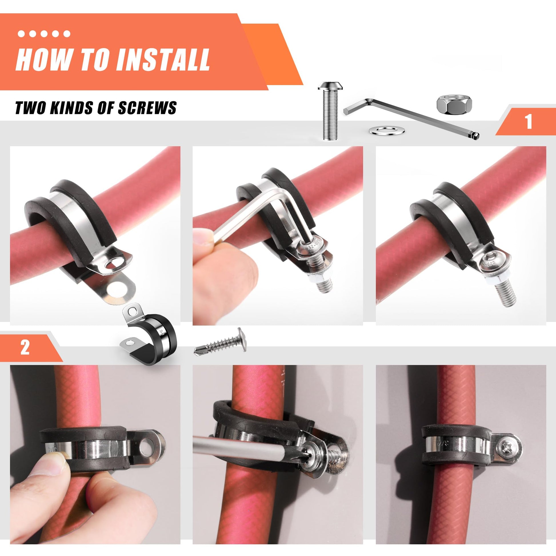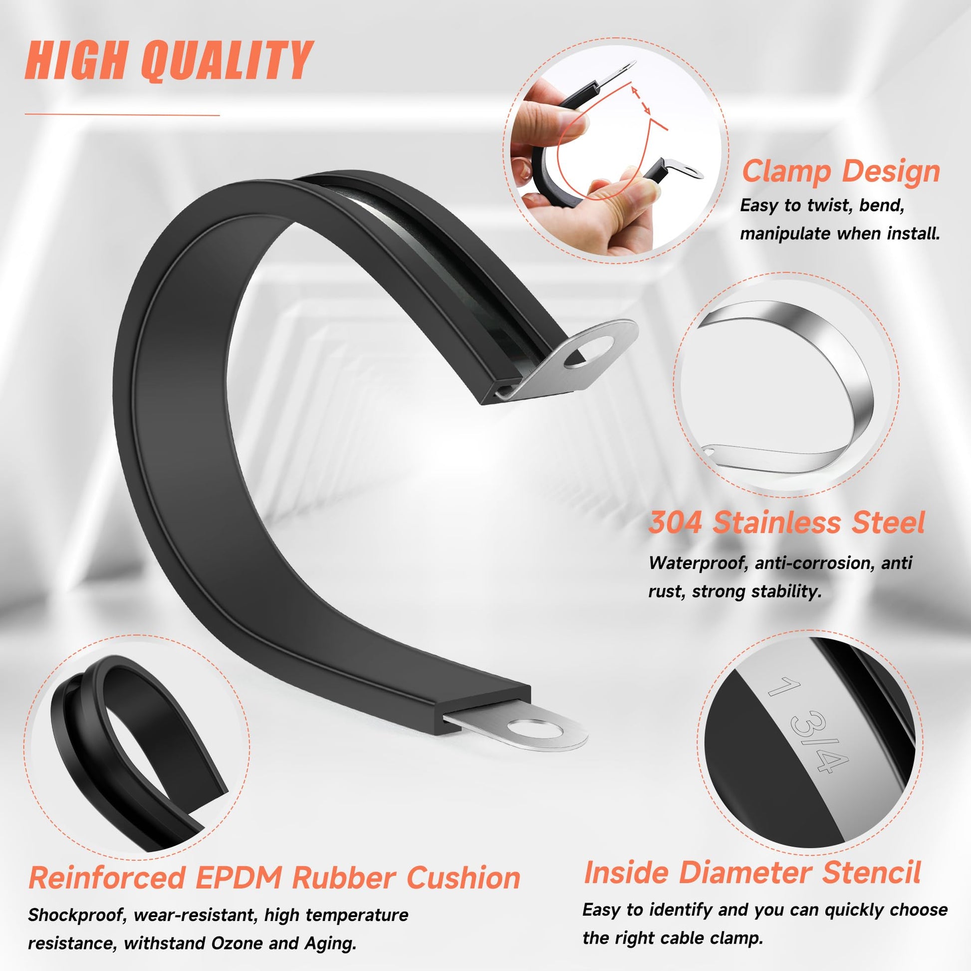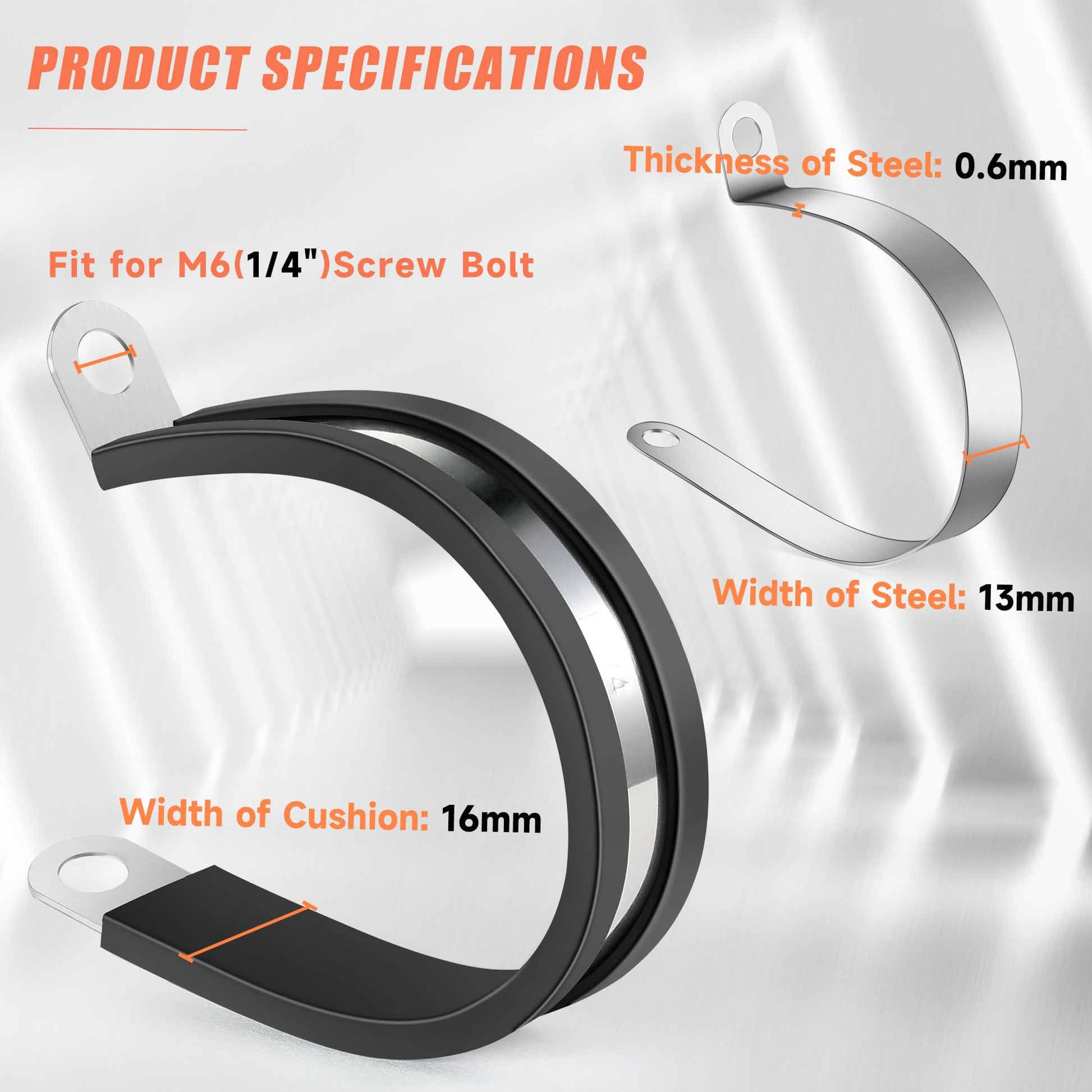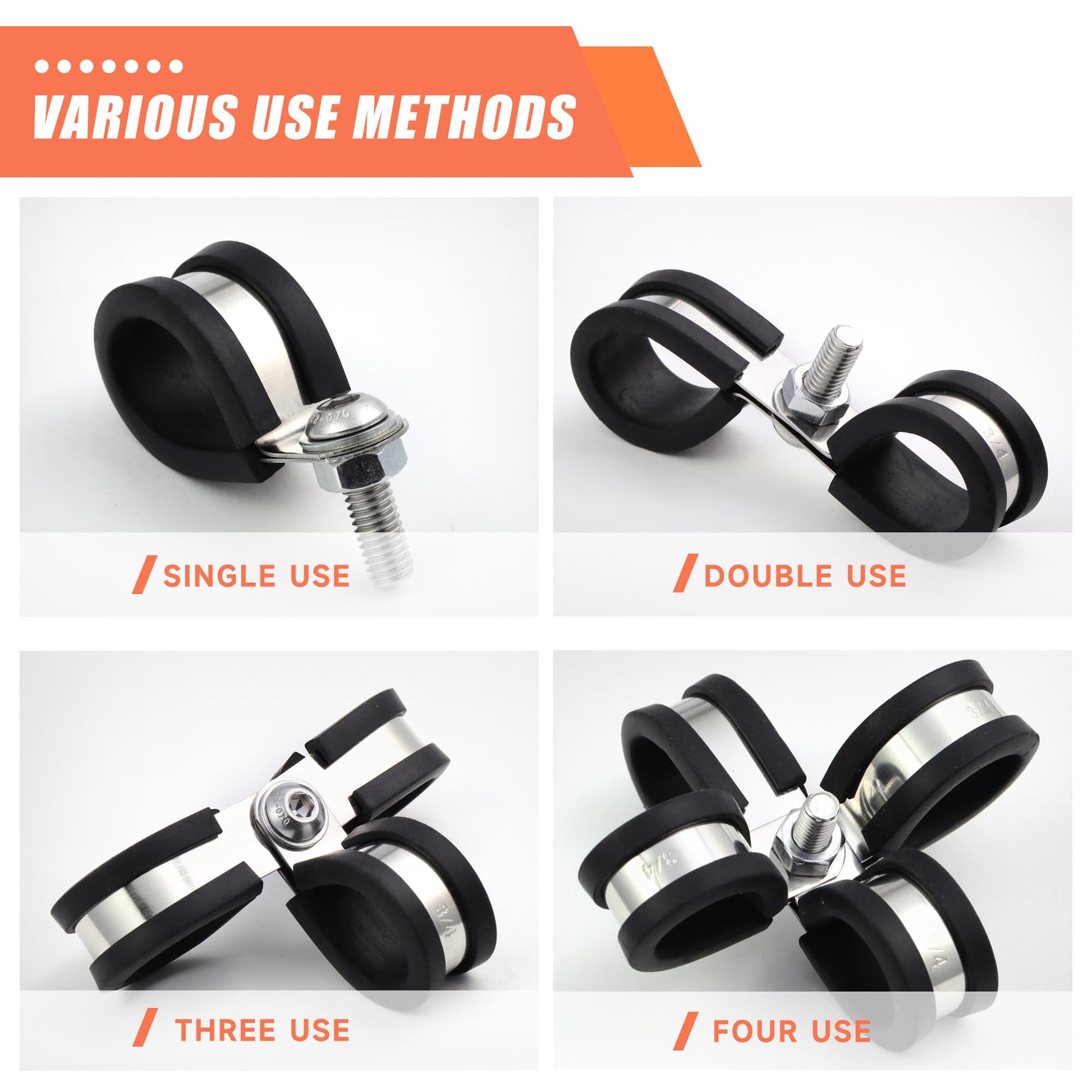- High Quality- Made from 304 Premium Stainless Steel material with quality rubber cushioned. Salt resistant, anti rust, anti-corrosion, waterproof, oil-proof. Clamps are sturdy, strong and reliable. The quality rubber insulation on the clamps holds up flawlessly. It is pliable which protect the tube well and keeps the clamp securely in place.