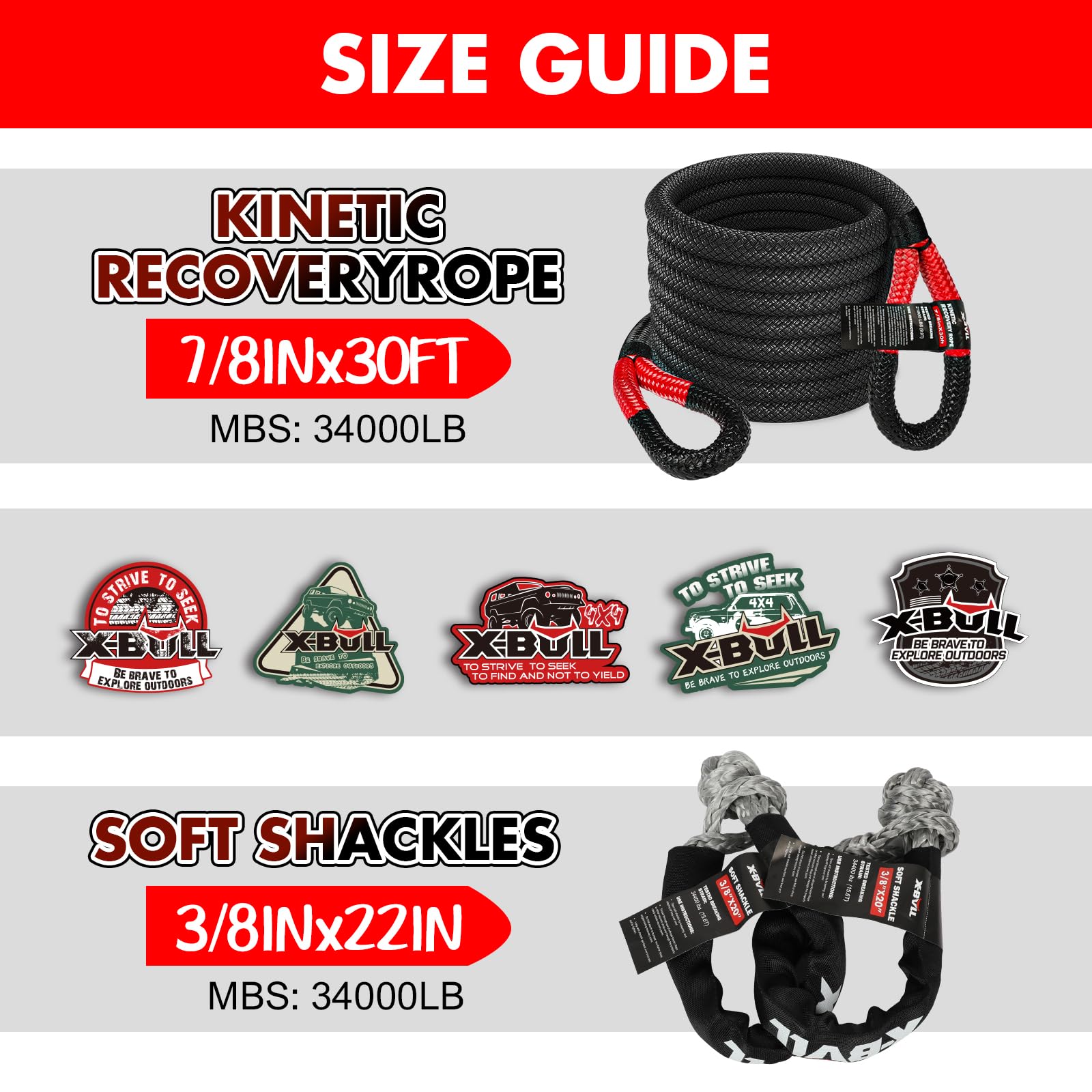 - [Package Includes] The X-BULL kinetic recovery kit includes a 7/8 inch × 30 ft kinetic recovery rope (rated for 34,000 pounds), two 3/8 inch × 22 foot spectra fiber soft shackles (rated for 34,000 pounds), 1 thick glove, 1 storage bag, and a pack of stickers.