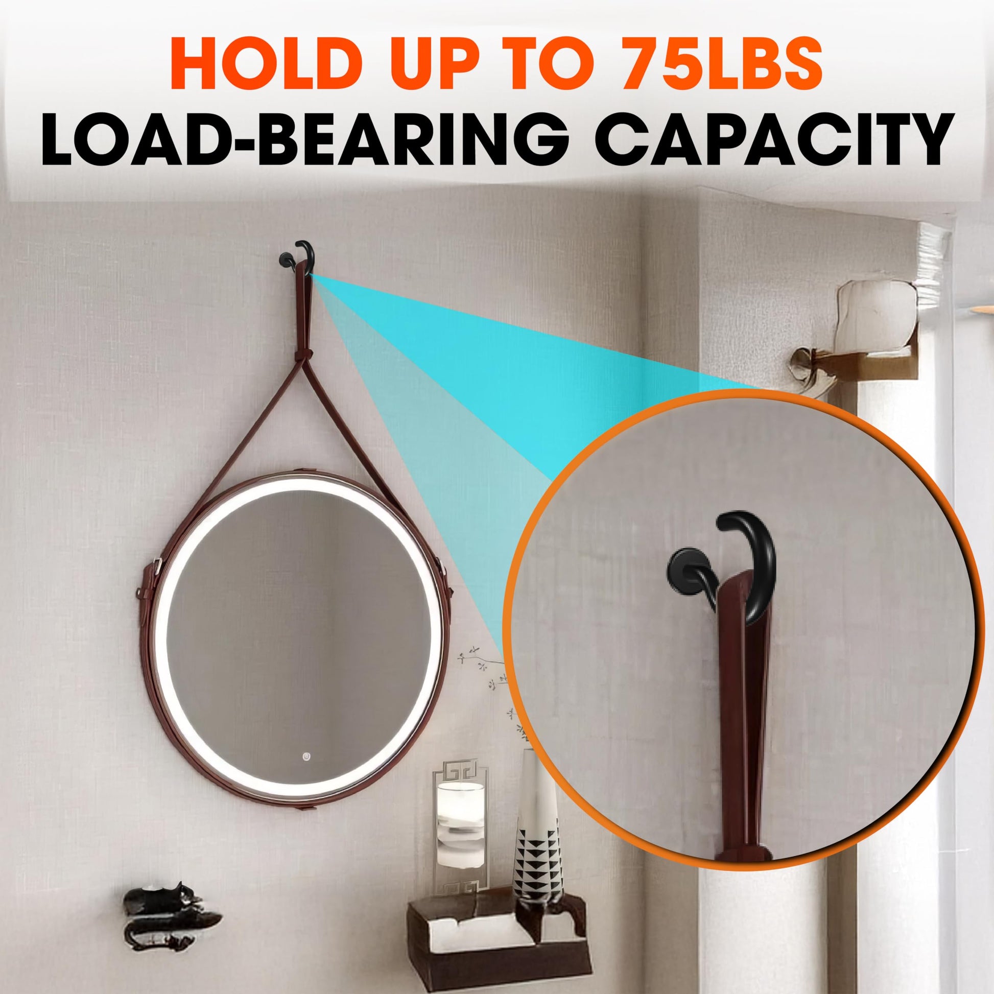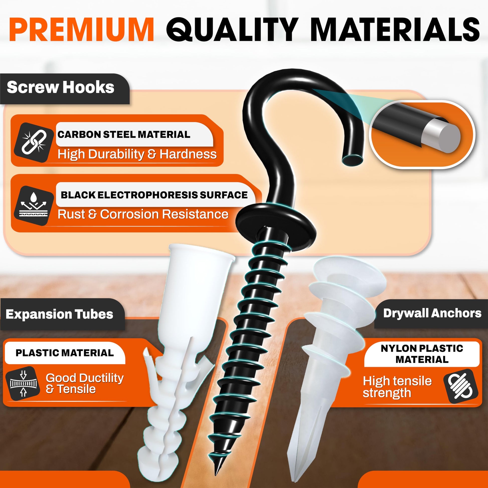 - [High-Quality Materials] The screw hooks are constructed from premium electrophoretic black-painted steel which is rust and corrosion-resistant, perfect for both indoor and outdoor. At the same time, our self-drilling drywall anchors and expansion tubes are made from durable nylon plastic. They can hold objects weighing up to 75 pounds and provide a robust and secure grip on any wall.
