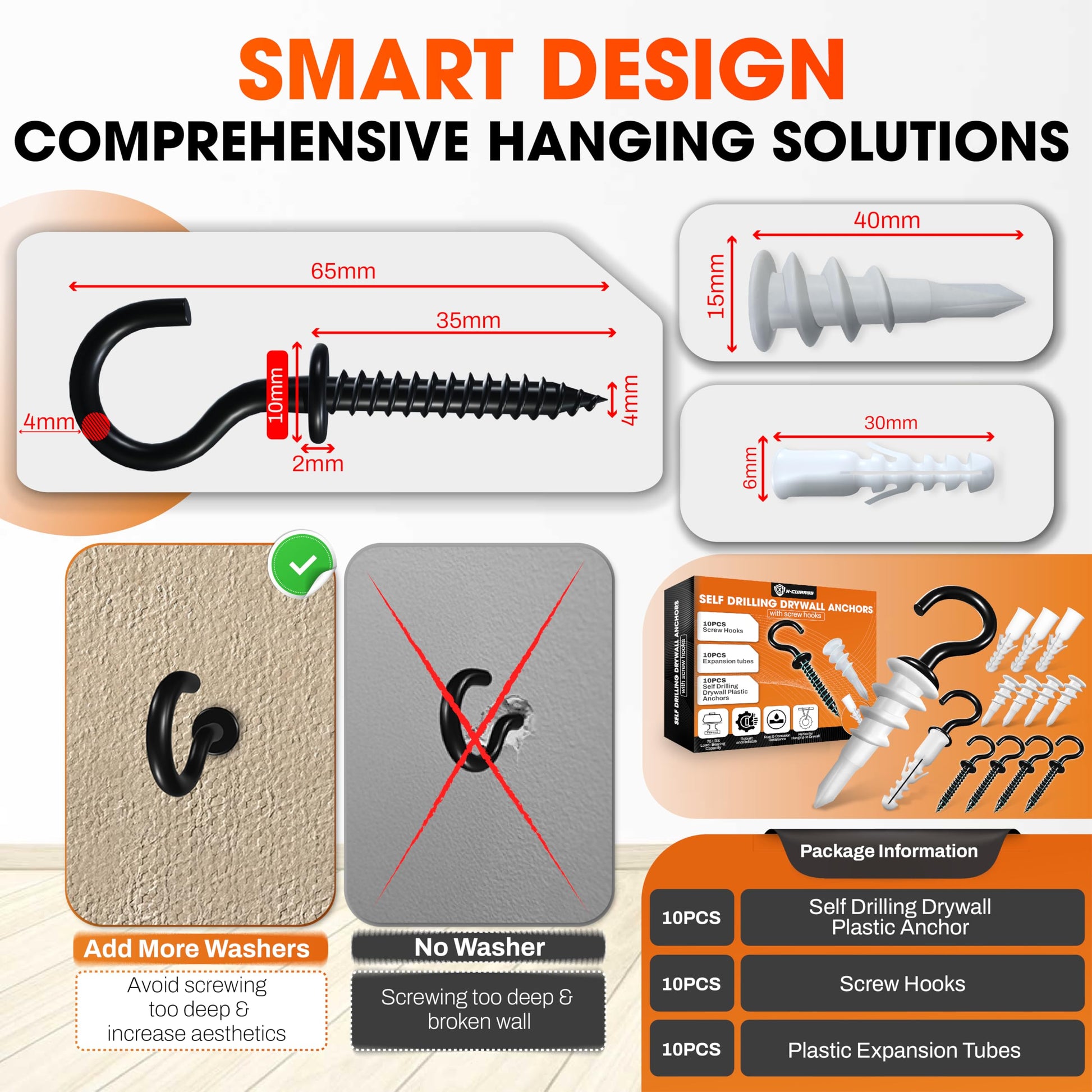 - [Warranty & Package] We are confident that our products are tested through many strict processes before packaging, guaranteeing that the product delivered to customers is always in the best state. If there are any defects or issues, please contact us for a refund within 30 days. Packing included: 10 PCS Screw Hooks + 10 PCS Self Drilling Drywall Plastic Anchors +10 PCS Plastic Expansion Tubes